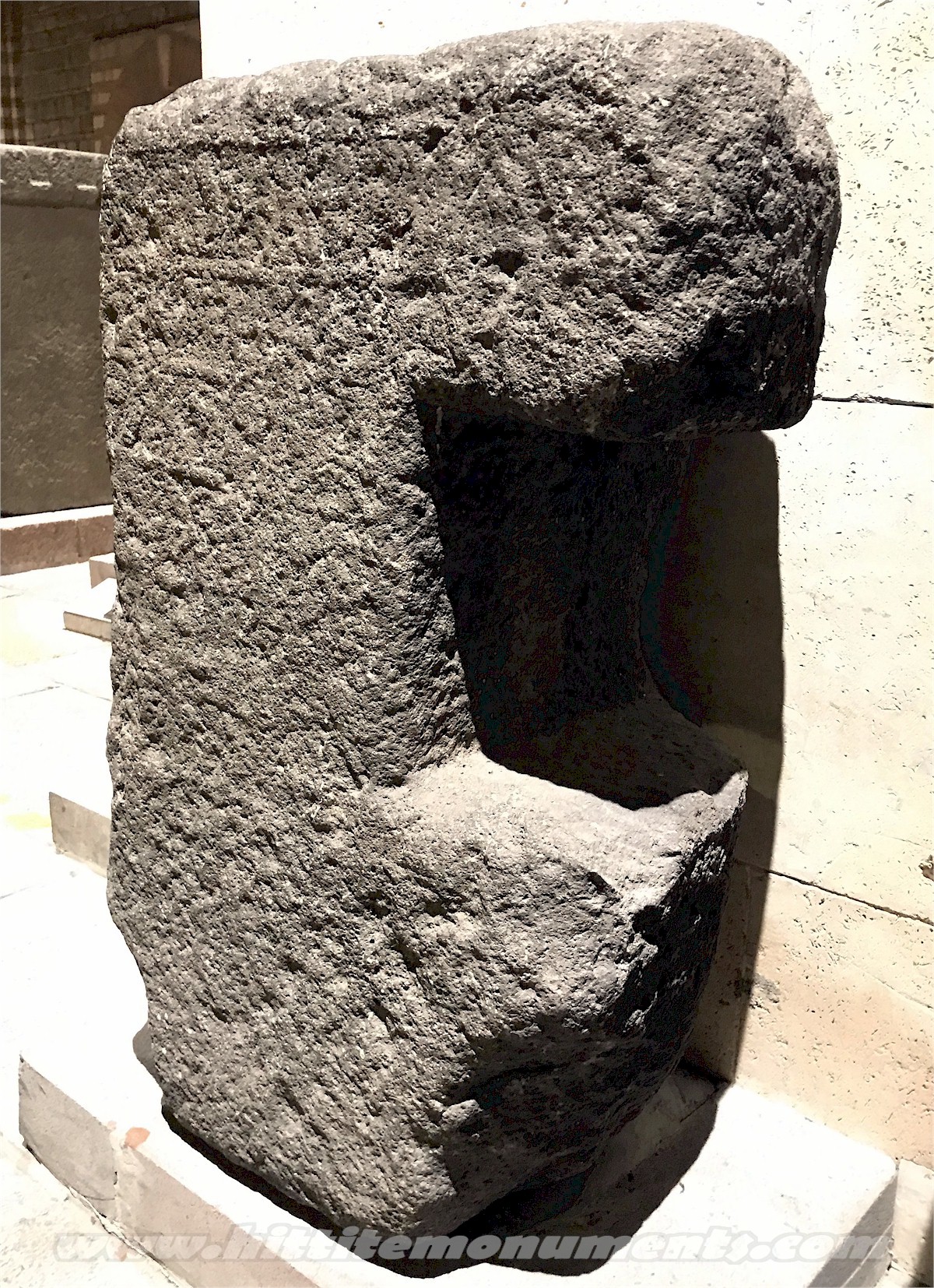 HOME - KARKAMIŞ TÜRKÇE Stele The bottom half of a basalt stele was reportedly found sometime before 1911 in the Silsile/Sinsile village, now known as Soylu, about 8 km to the west of Karkamış. The rectangular gap on the left side is also due to subsequent damage. It has the last 6 lines of a badly preserved inscription (KARKAMIŠ A15a = SİLSİLE 1). Currently in the Anatolian Civilizations Museum in Ankara. |