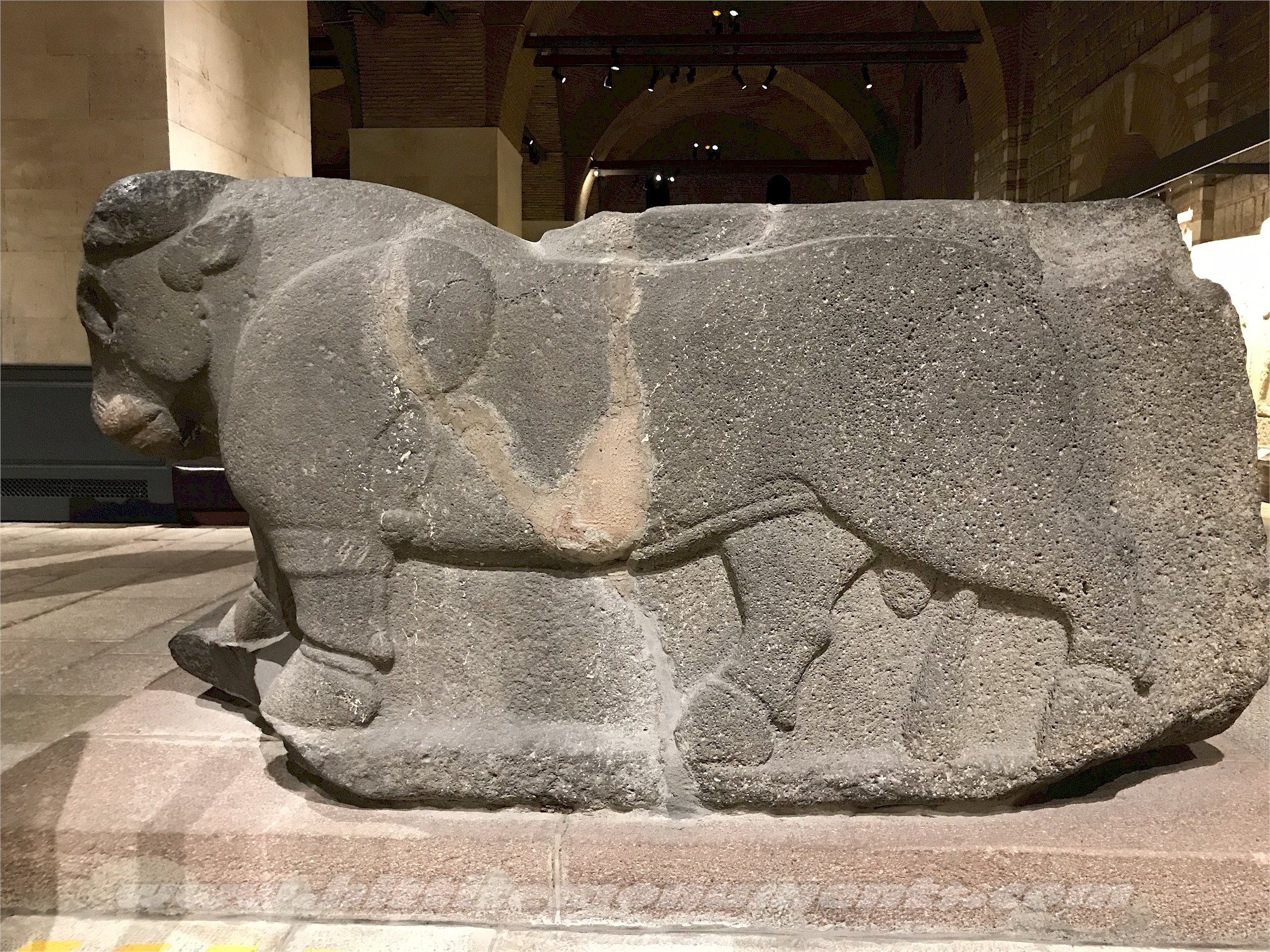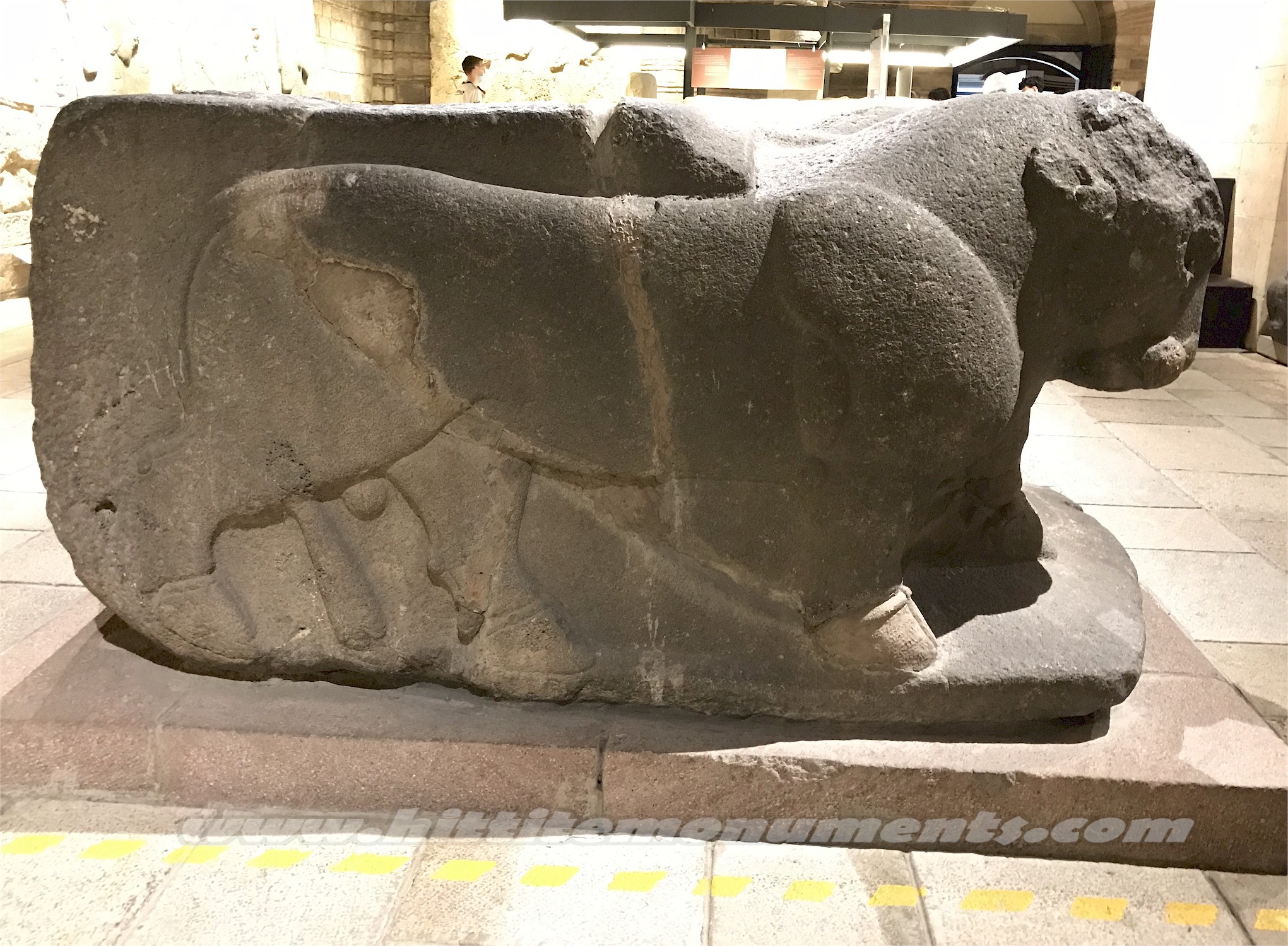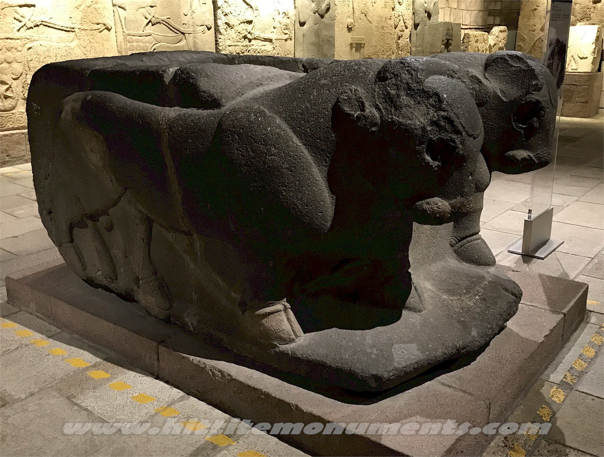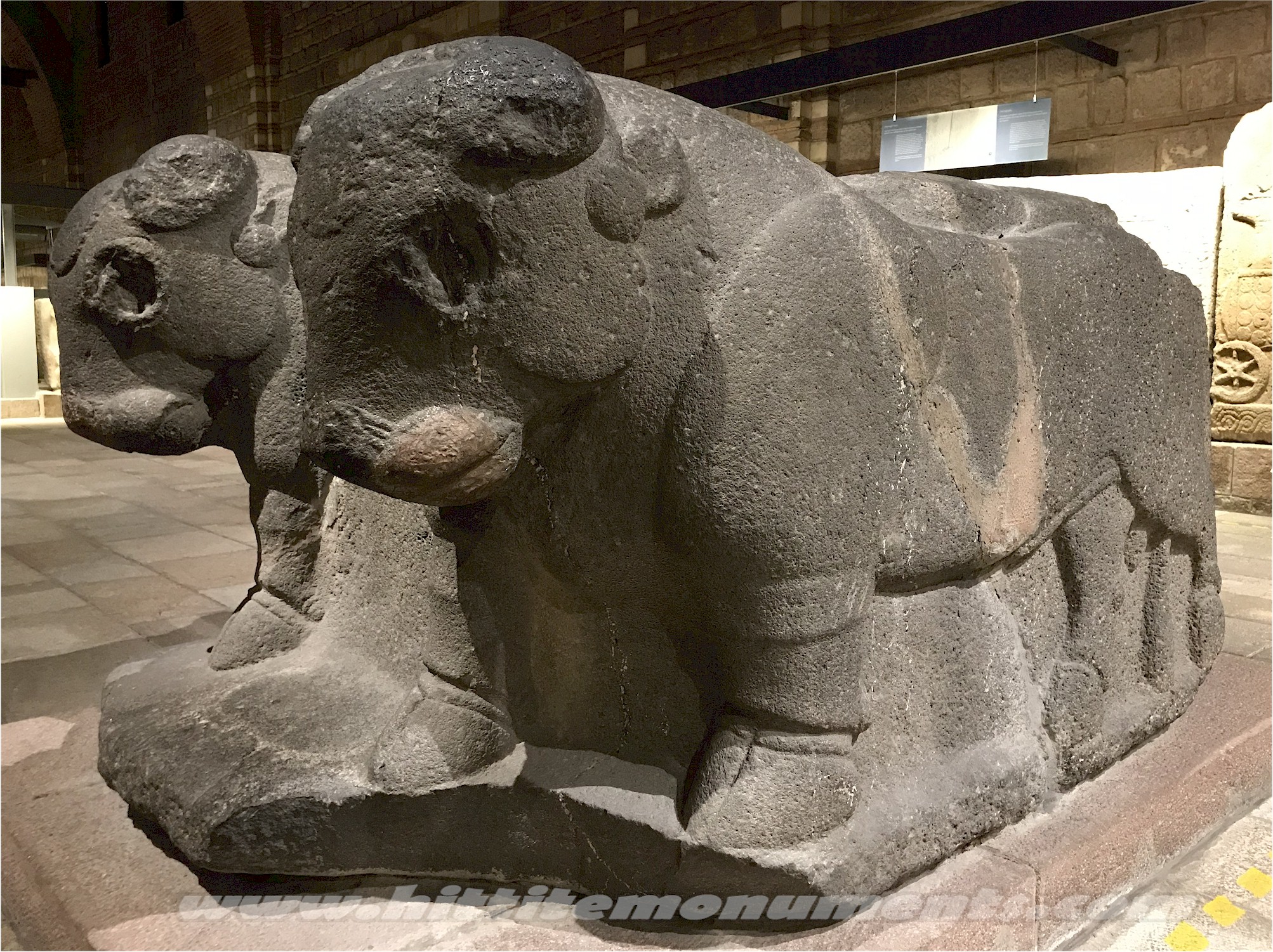 HOME - KARKAMIŞ TÜRKÇE Double bull base The basalt double-bull base was found in situ but in broken pieces in front of the entrance of the Storm-god temple and was put together by L. Woolley (see previous image). It is about 1.2 meters in height and 2.4 meters in length and very similar in style to the double bull base found on the east side of the great stairway. In their original condition, the bulls probably had inlaid eyes and perhaps also horns. It is possible that the bulls were the base of a statue, but the depression on its top is deeper than similar bases and may have also served as a basin. Stylistically, it has been dated to the 9th century BCE. The base is in the Anatolian Civilizations Museum in Ankara. |