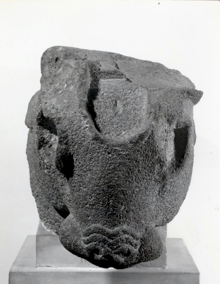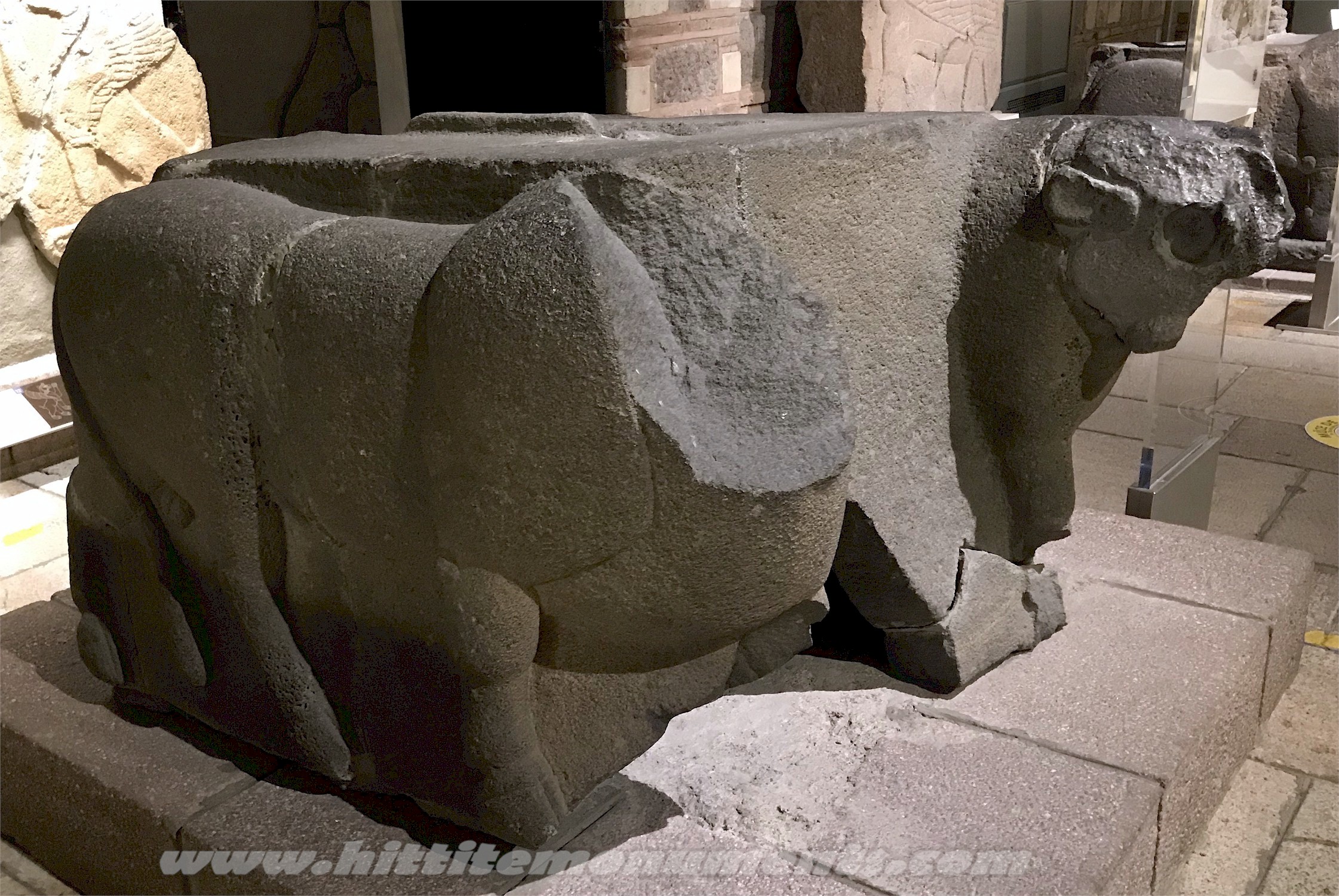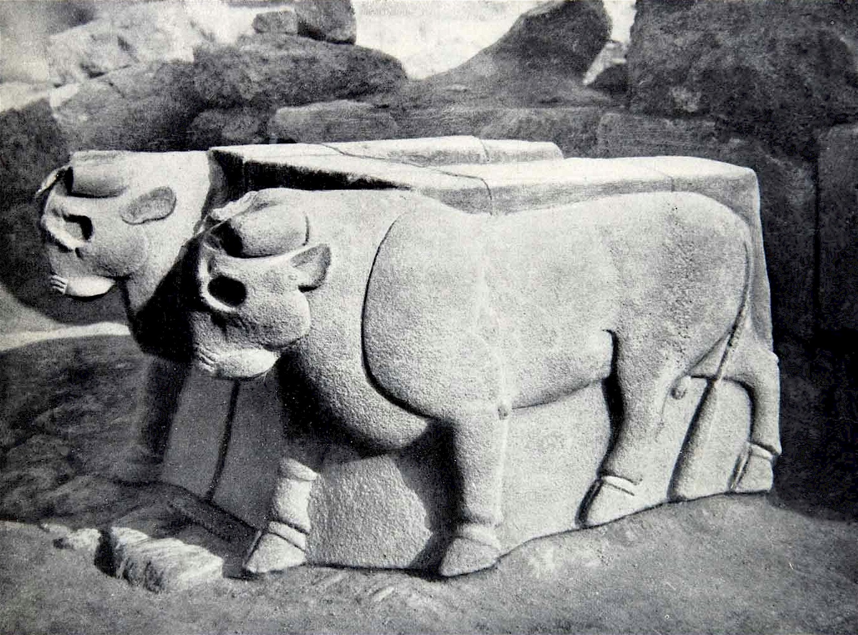 HOME - KARKAMIŞ TÜRKÇE Double bull statue base The basalt double bull statue base was found in situ at the east side of the great staircase, on the terrace located right behind the so-called Great Lion Slab (see small image below). It is about 1.4 meters in width and 1.2 meters in length and very similar in style to the double bull base found by the temple entrance. In their original condition, the bulls probably had inlaid eyes and perhaps also horns. It is likely that once a statue of an ancestral king stood on top of it. Cup marks on the base suggest that ritual performances were conducted by the statue. Stylistically, it has been dated to the 9th century BCE. Although found intact, the heads of the bulls were broken in subsequent years, and eventually both of them ended up in the British Museum. The base itself is in the Anatolian Civilizations Museum in Ankara. |