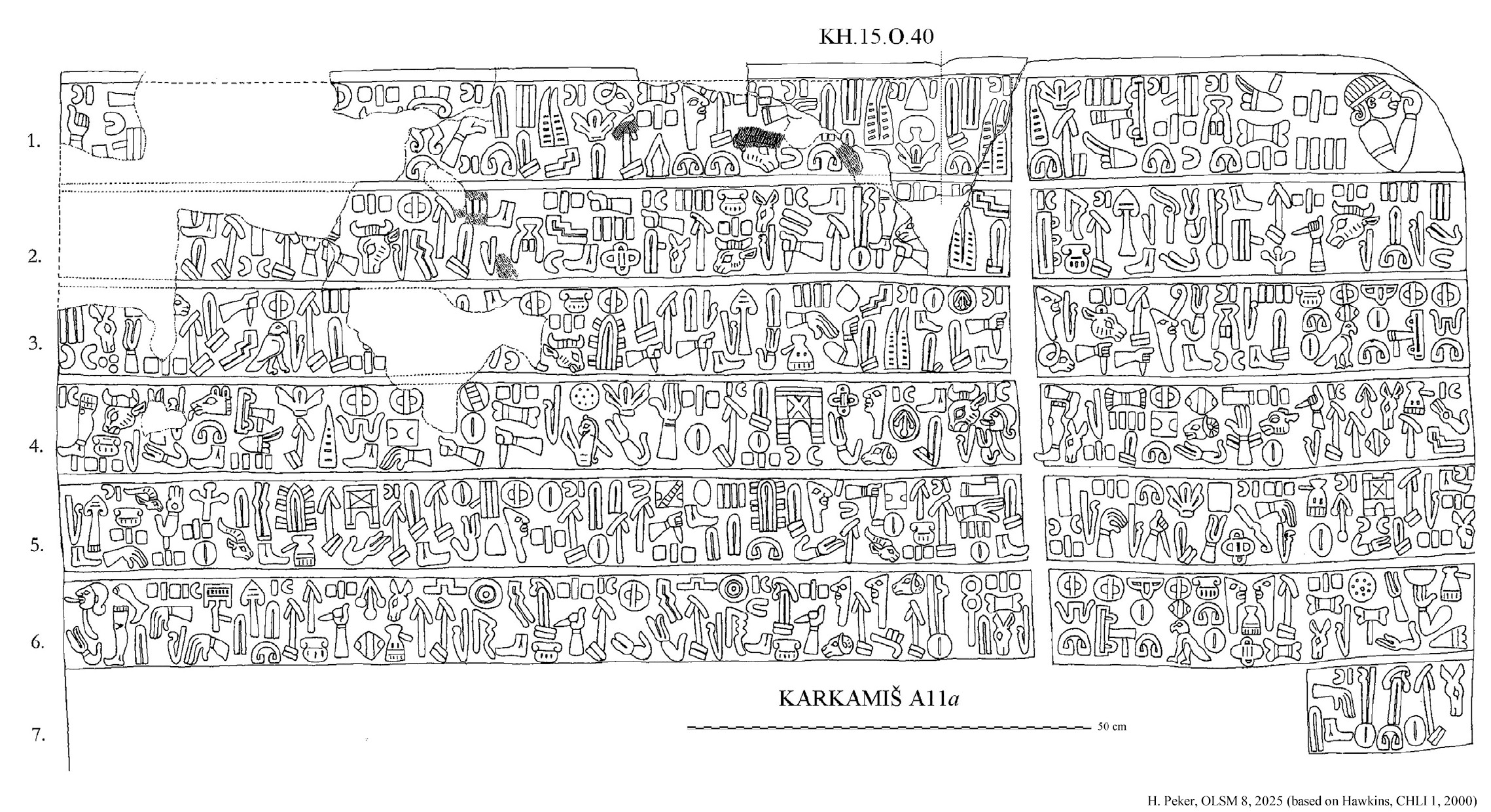 HOME - KARKAMIŞ TÜRKÇE The basalt block with a seven-line Luwian inscription (KARKAMIŠ A11a) was found in situ as the doorjamb at King's Gate (see first image below). Unfortunately, this block was destroyed after the early excavations were completed. Several small fragments of it are in the Anatolian Civilizations Museum, and one fragment is in the British Museum. A few small fragments were rediscovered during the latest excavations. The doorjamb across the gate was not inscribed. The block was 0.85 meters high and 1.75 meters wide. The author of the inscription is Katuwa, the Country-Lord of Karkamiš, and it is a building inscription and dedication to gods Tarhunza, Karhuha, and Kubaba. Katuwa gives his genealogy as the son of Country-Lord Suhi, the grandson of Country-Lord Astuwalamanza. Dates to the 10th-9th century BCE. |