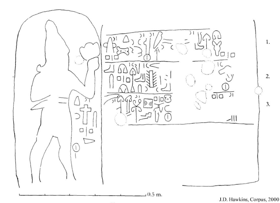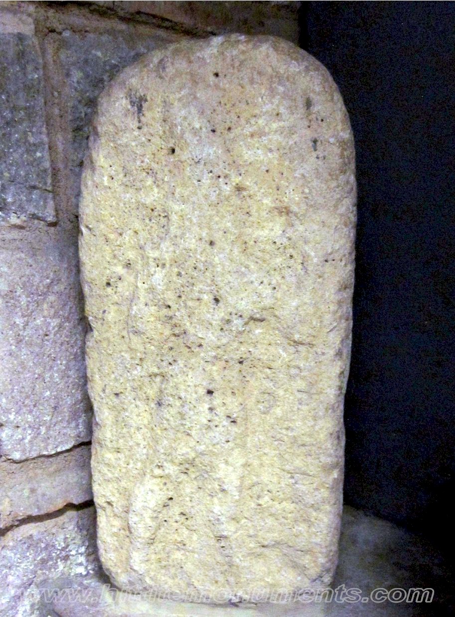 HOME - KARKAMIŞ TÜRKÇE Stele The limestone stele with a round back was found during the 1910s in a house in "upper Karkamış" used as a door sill. The front has a rather weathered male figure, possibly a deity, with some inscriptions in front of the figure. On the back are the traces of a 3-line Luwian inscription. It is about 70 cm high and 35 cm wide. Currently in the Anatolian Civilizations Museum in Ankara. |