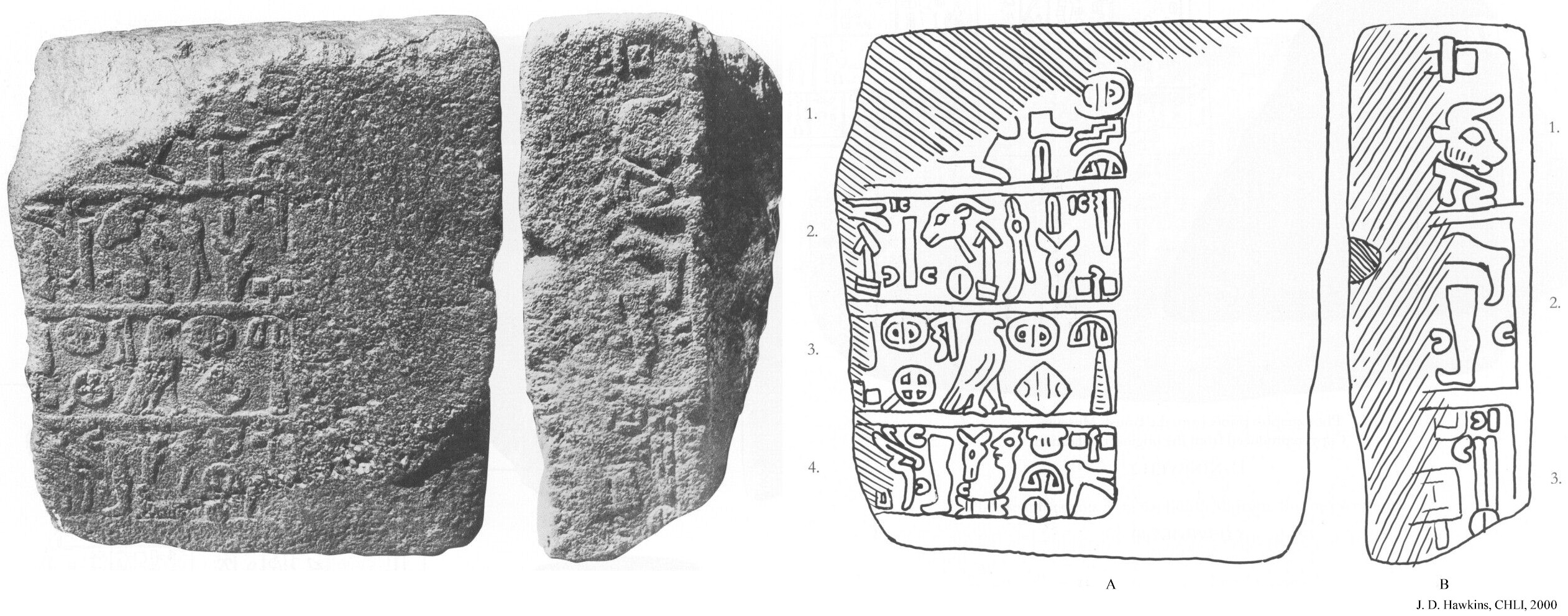 HOME - KARKAMIŞ TÜRKÇE >Inscribed Orthostat (GELB) The inscribed basalt orthostat is only known from the photographs of Ignace Gelb, and consequently, the inscription has been labeled as GELB in the literature. There is no information about its discovery and current whereabouts. The orthostat was preserved in its original height but broken on the left side. The front face has a 4-line Hieroglyphic Luwian inscription, and the right side has a small section of an apparently separate 3-line inscription. It must have been part of a bigger inscription that continues on other orthostats. It is a royal inscription that mentions gods, succession, and destruction, but otherwise the content is unclear. Stylistically, it has been associated with the Karkamış inscriptions of the 8th century BCE. |