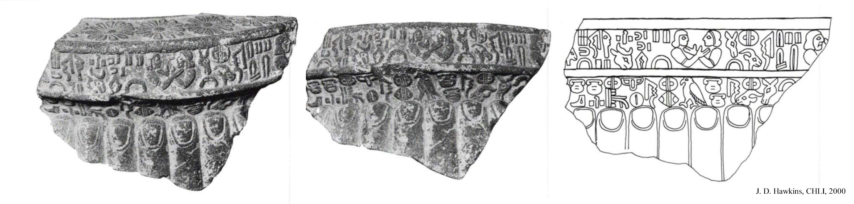 HOME - KARKAMIŞ TÜRKÇE Inscribed Stone Bowl Fragment (BEIRUT) The fragment with a partial Luwian inscription belongs to the edge section of a stone bowl. There is no information on its find place and current whereabouts, and it is known only from photographs that surfaced in the Beirut antiquities market; hence, the fragment is labeled in the literature as BEIRUT. However, stylistically it is very similar to Karkamış inscriptions and may have originated from there. The inscription mentions a person named Iya and offerings to deities Santa, Kubaba, and Karhuha. |