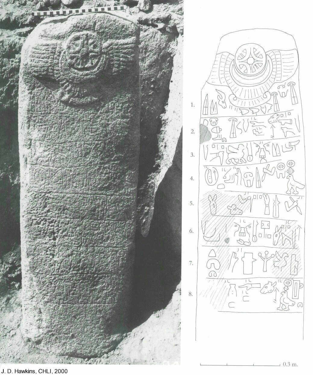 HOME - KARKAMIŞ TÜRKÇE Stele of the son of Suhi I The basalt stele was excavated in the courtyard of the Storm-god Temple prior to 1913. It is about 1 m in height and 0.4 meters in width. The 8-line inscription (KARKAMIŠ A4b) commemorates an accomplishment of "Ura-Tarhunza, Great King, Hero, King of the Land of Karkamış, son of [Sa]paziti, Great King, Hero" and names Arnu[...], a Priest of Kubaba and the son of Suhi, as the person who erected the stele (see also a very similar stele of Suhi I). The stele is dated roughly to the 10th century BCE and is currently in the Anatolian Civilizations Museum in Ankara. |