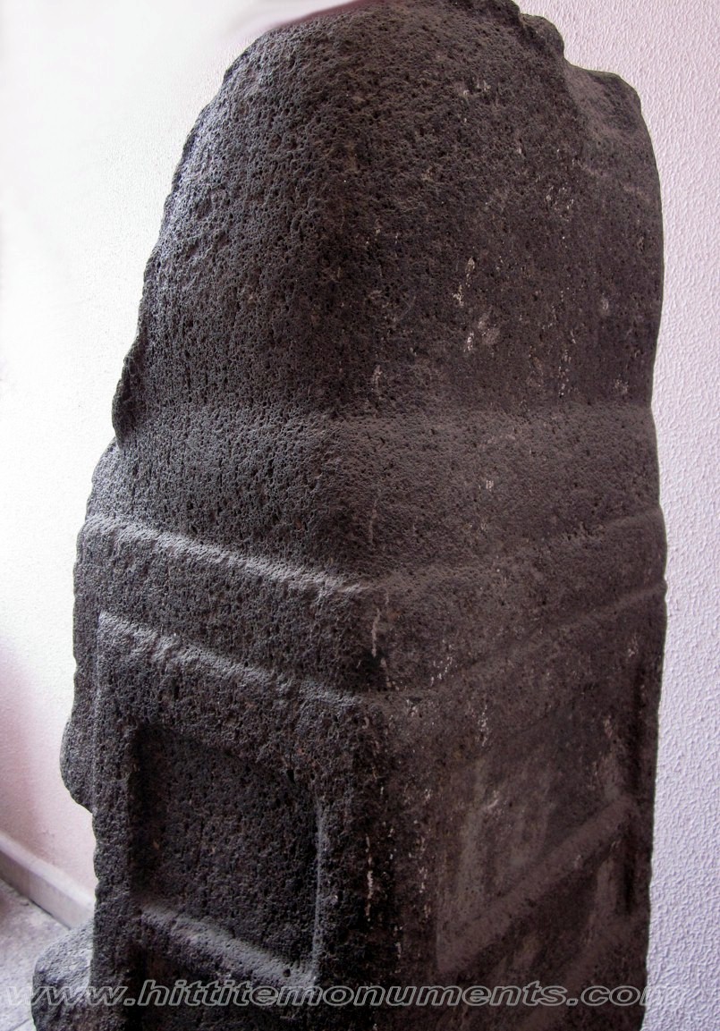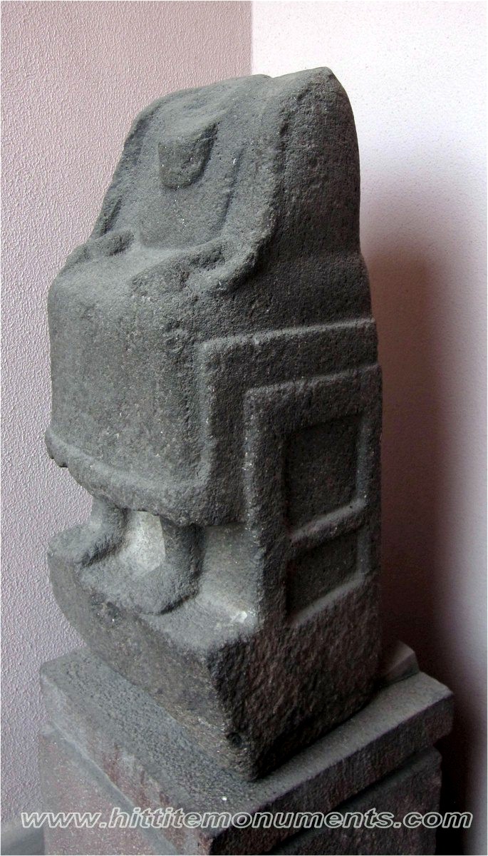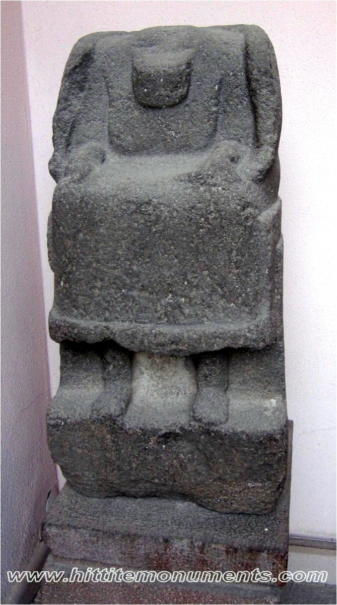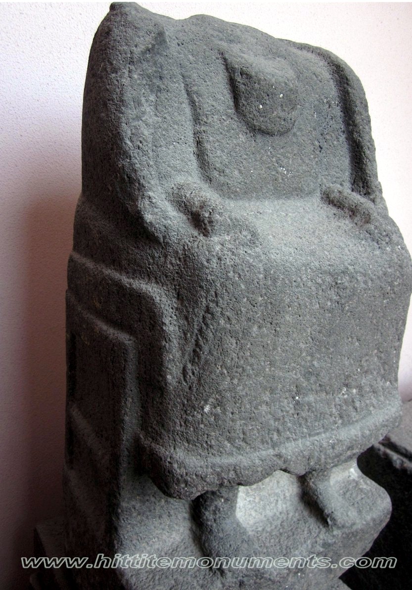 HOME - KARKAMIŞ TÜRKÇE Statue of a ruler The basalt statue was found outside the southern wall of the Hilani building, reused in a Roman-era wall. It is about 80 cm in height. Of the missing head, only a piece of the beard falling on the chest is visible. There was a cuneiform inscription on the lower front of the garment and on the back, but it seems to have been deliberately effaced, and all that remains are a few characters. This is also the only monumental cuneiform inscription found in Karkamış. On stylistic grounds, a pre-Hittite date has been suggested (S. Aro). The statue is currently in the Anatolian Civilizations Museum in Ankara. |