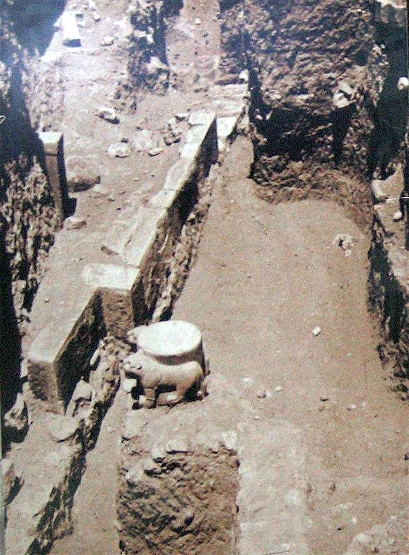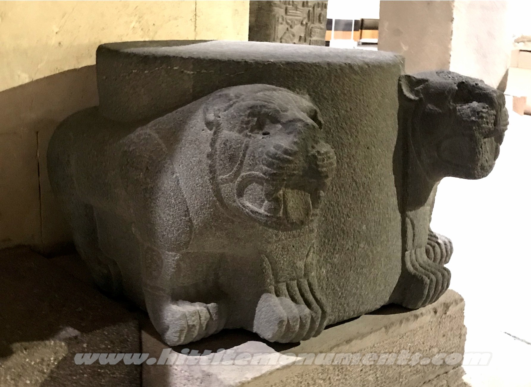The basalt column base decorated by two sculpted lions was found at the northwest end of the citadel. Its diameter is about 60 cm. Currently in the Anatolian Civilizations Museum.