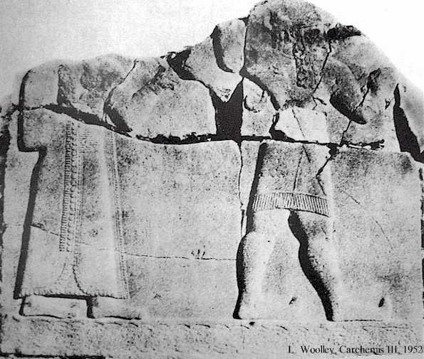 HOME - KARKAMIŞ TÜRKÇE Relief of a God and Goddess The basalt relief fragment belongs to an orthostat of the Long Wall and dates from about 850-750 BCE. It is on display in the Anatolian Civilizations Museum in Ankara. The Storm God in front is shown with a raised hand holding an axe, and behind him is a goddess. The upper fragment of the Storm God figure has been lost subsequent to initial excavations. The upper section of the goddess in the museum is reconstructed based on similar reliefs. |