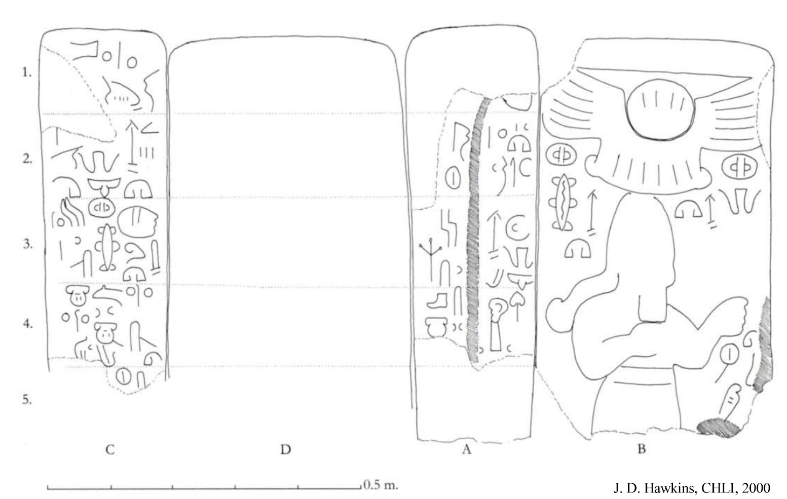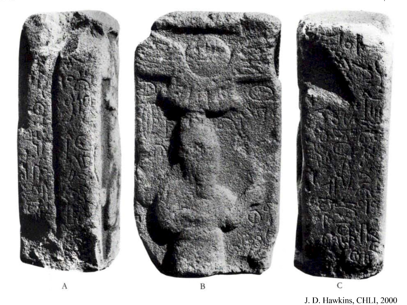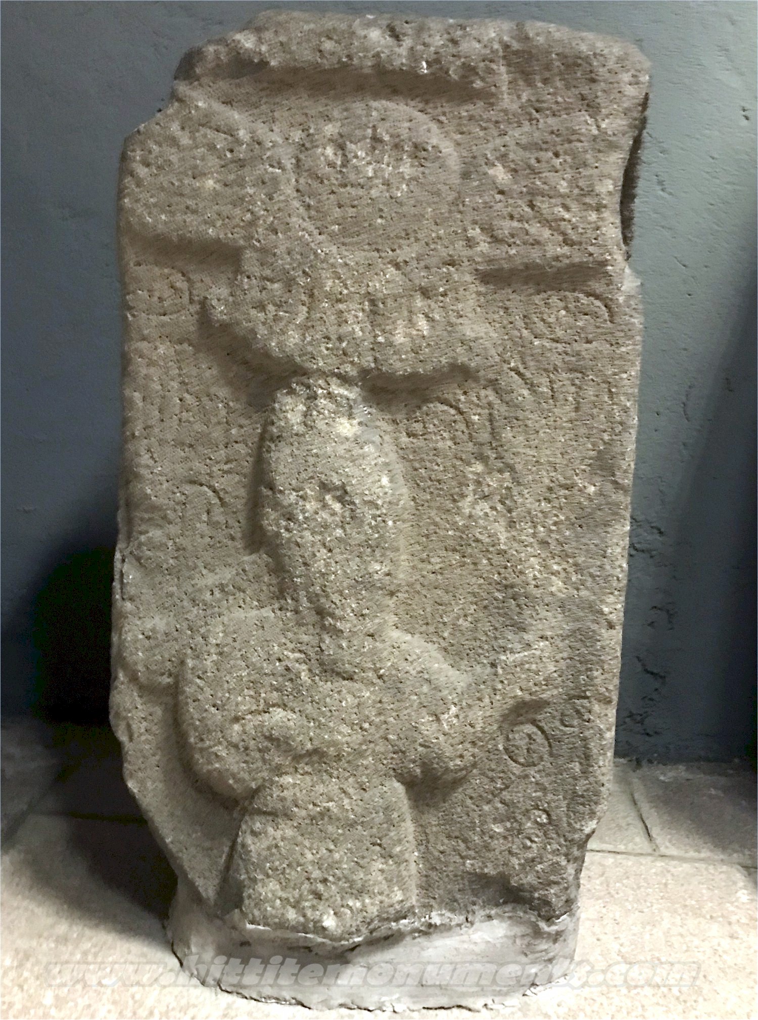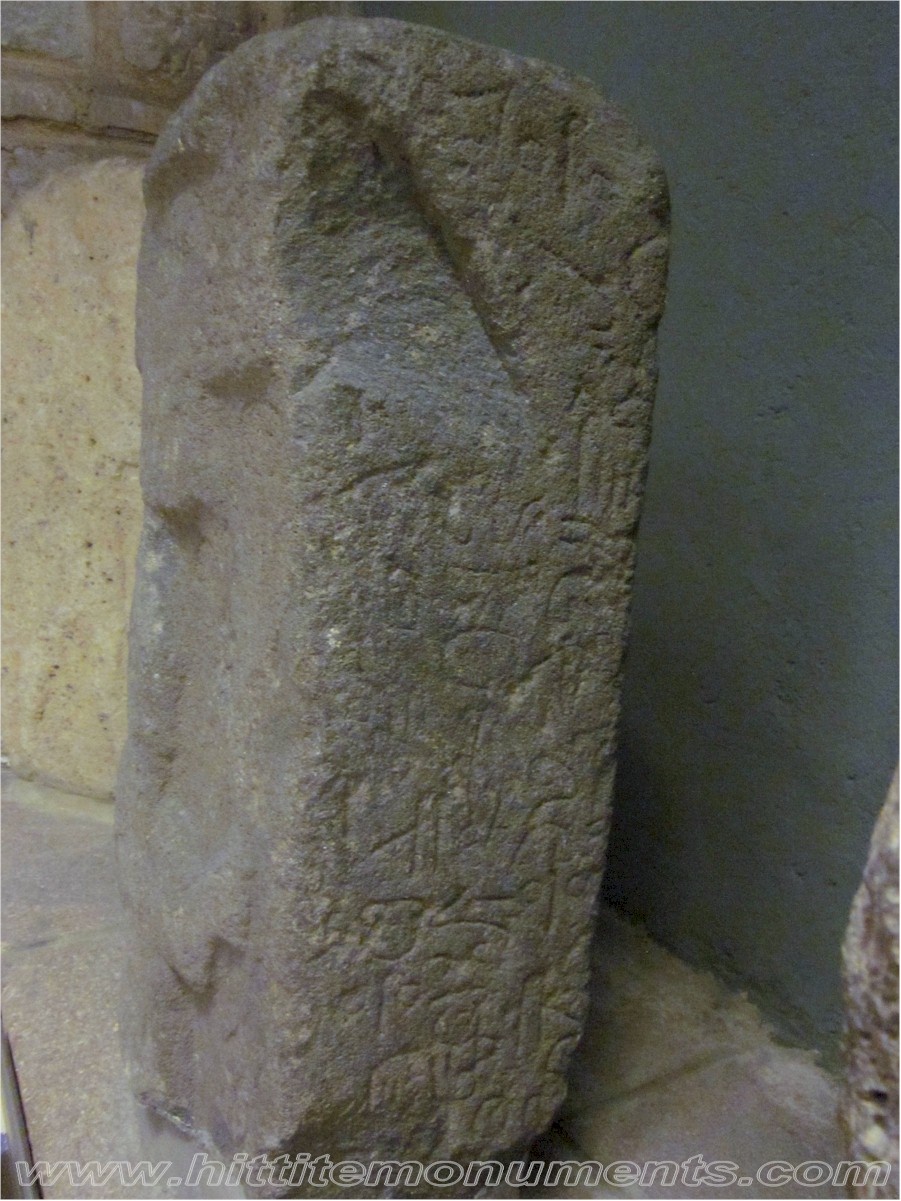 HOME - KARKAMIŞ TÜRKÇE The Storm-god(?) Stele Top half of the basalt stele is about 60 cm high, 35 cm wide, and 20 cm deep. According to Woolley, it was brought from the village of Shamak, which lies about 18 km to the southeast of Karkamış. Details of the male figure shown below the winged sun-disk are not clear. The Luwian inscription that surrounds the stele is only partially readable and mentions the Storm-god and Sun-god. It may date to the 8th century BCE and is currently in the Anatolian Civilizations Museum in Ankara. |