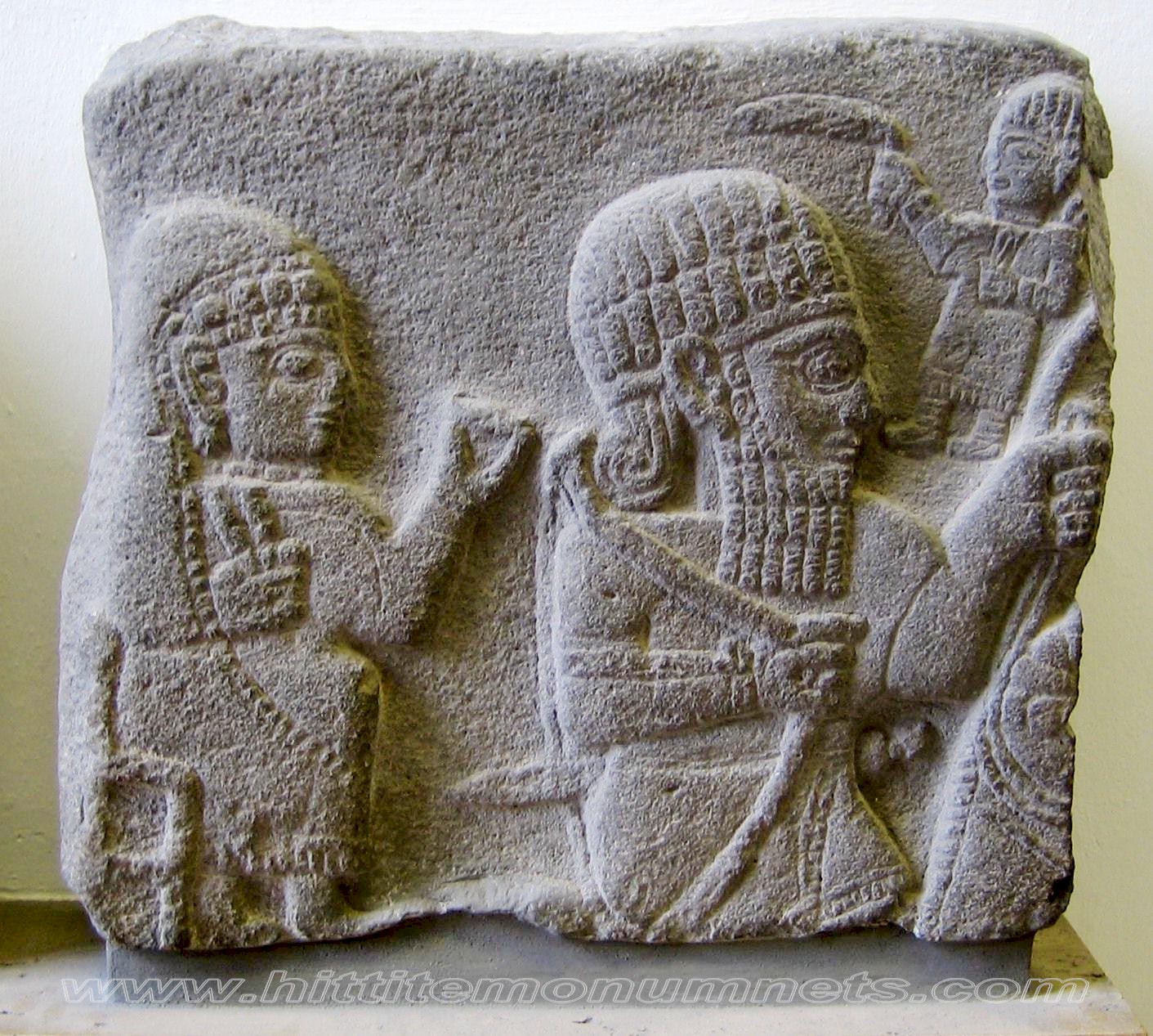 HOME - MARAŞ TÜRKÇE Stele Fragment The basalt stele fragment is about 47 cm high and 53 cm wide. In the foreground, it shows a male figure with a bow on his right shoulder and a sword on his belt. Although not clearly visible, he is probably on the back of a horse and holding the reins with his left hand. In the background is a seated woman, and in the upper right corner is a servant with a palm leaf. It has been dated to the 8th century BCE. Apparently shortly before 1910, the stele fragment entered into the possession of the Vorderasiatisches Museum in Berlin, where it is currently on display. |
