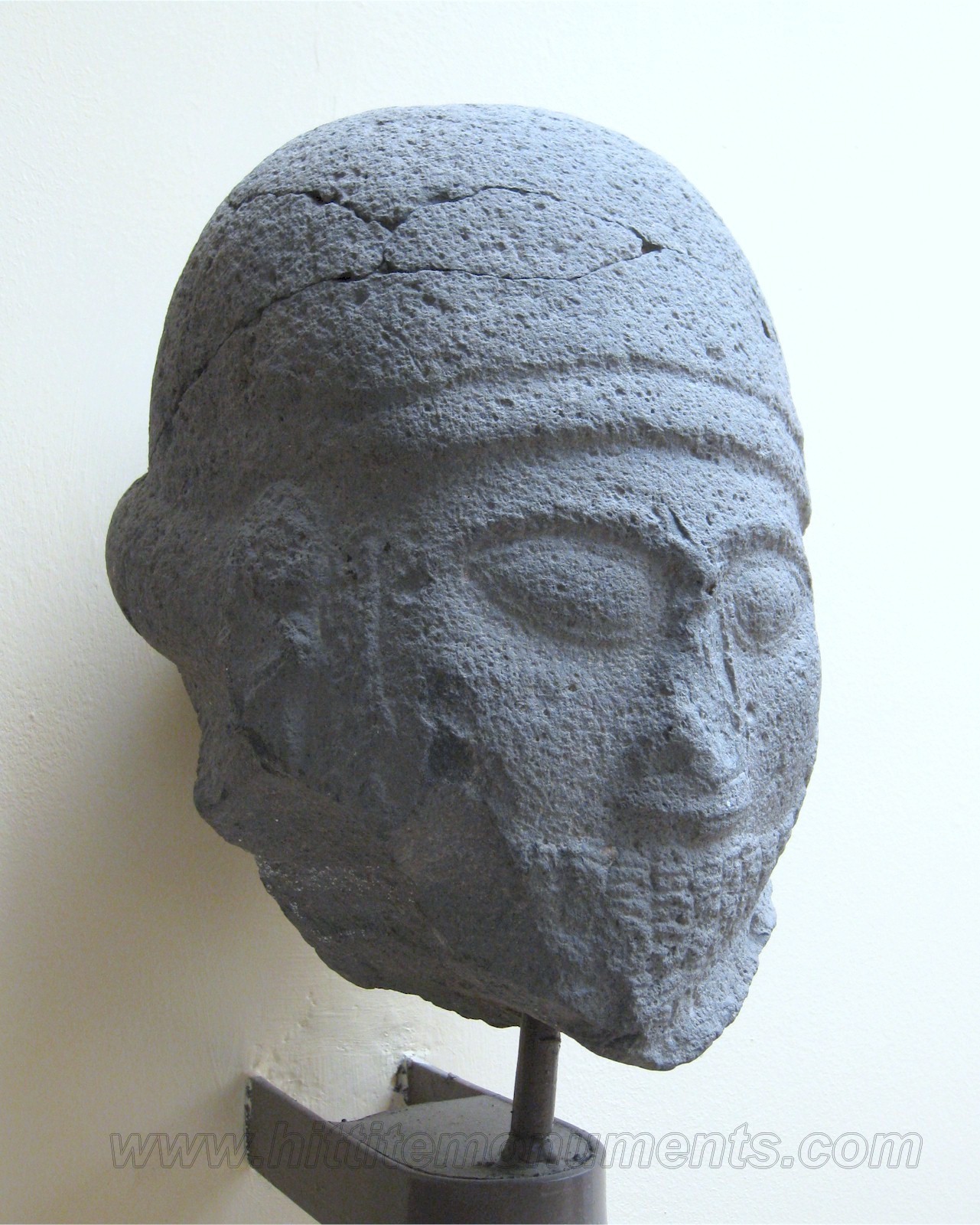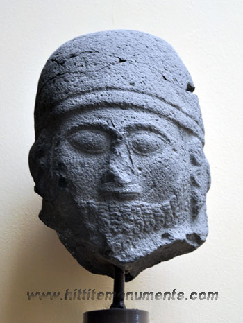 The basalt fragment is the head of a bearded male with a round cap. It is about 32 cm by 32 cm. A date around 925-875 BCE has been suggested. Currently on display in the Istanbul Archaeology Museum.