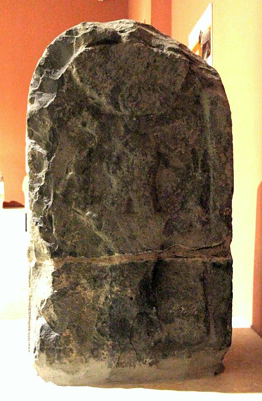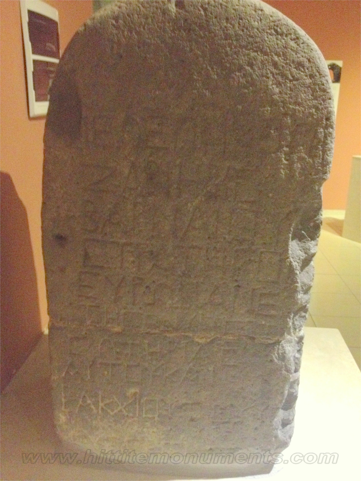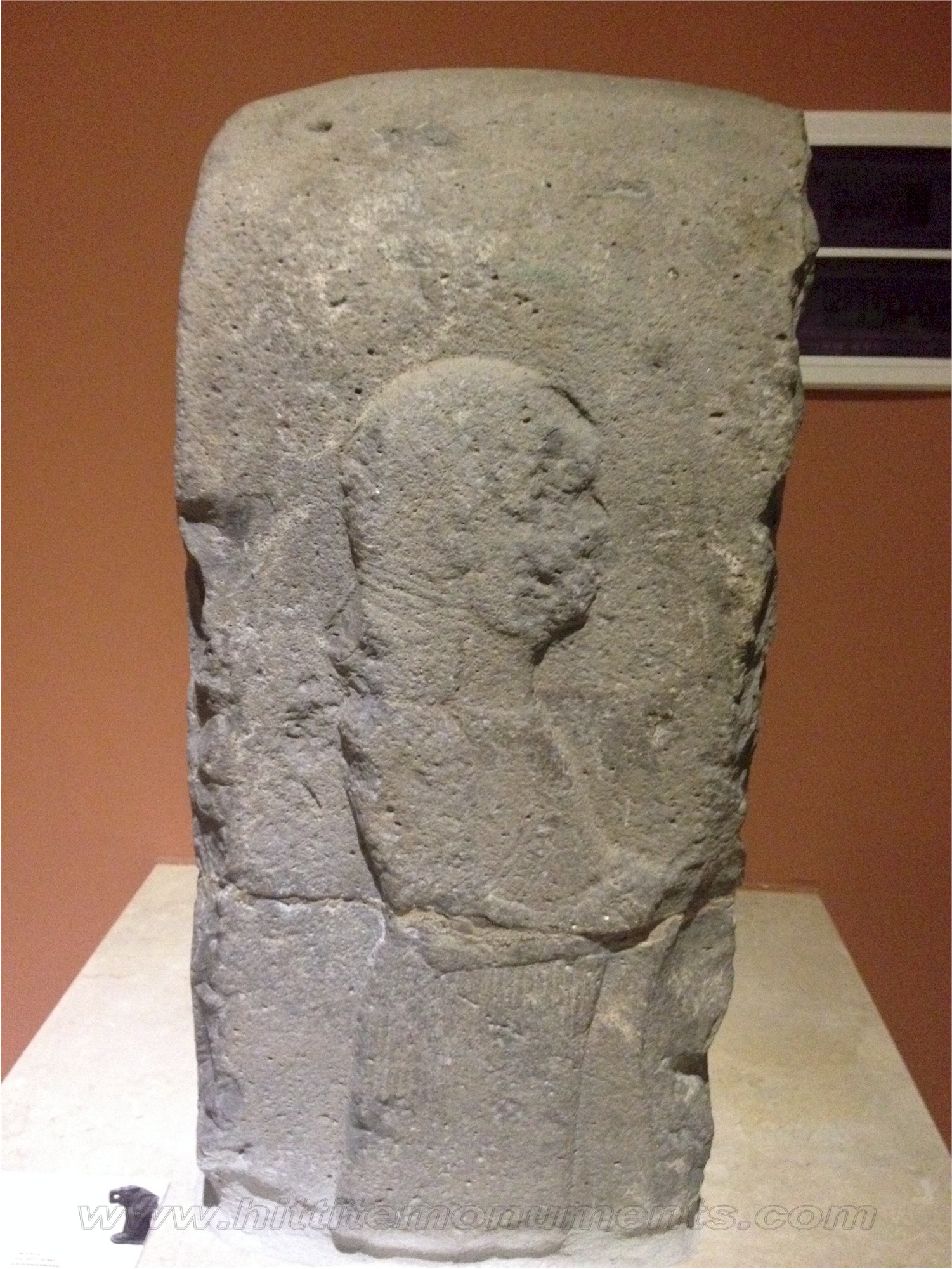 HOME - MARAŞ TÜRKÇE Storm God stele The basalt stele has on its rather damaged front side a Storm God figure who is holding a trident-shaped thunderbolt in his left hand and an axe in his right hand. There is a winged sun disc at the top. On the left side of the stele is a beardless man or perhaps a female figure, and on the back side is a Roman-era inscription. It is on display at the Kahramanmaraş Museum. |