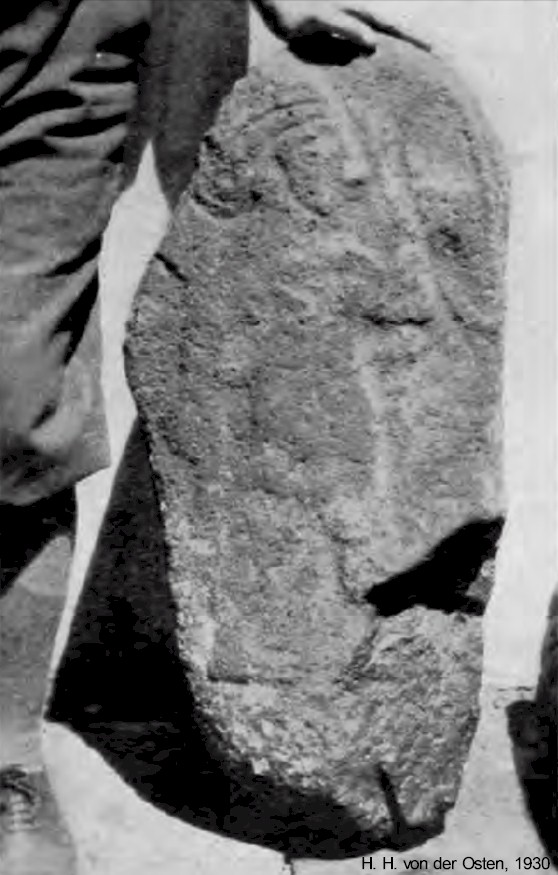 The basalt stele or orthostat fragment shows a bearded male figure holding a bow. It is about 87 cm high and 40 cm wide. Currently in the inventory of the Adana Museum.