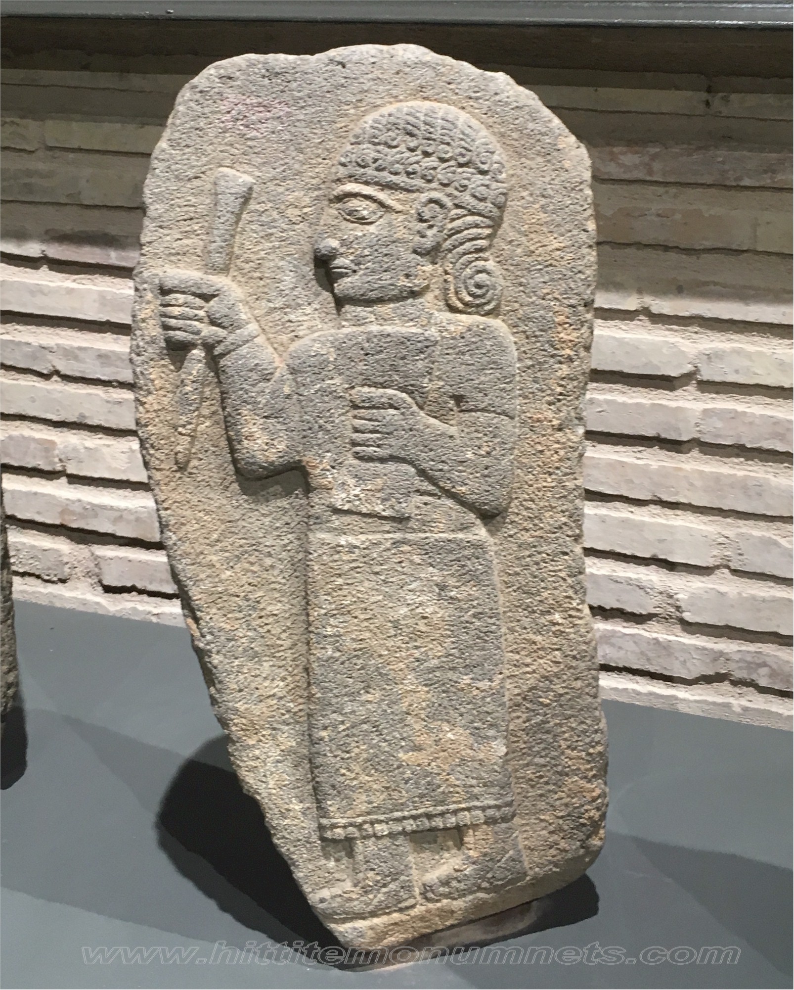 Bazalt taşa işlenmiş stelde ayakta duran bir genç erkek elinde bir yazı kalemi ve yazı tahtası ile betimlenmiştir. Yaklaşık 65 cm yüksekliğinde ve 99 cm genişliğindedir. Adana Müzesinde sergilenmektedir.