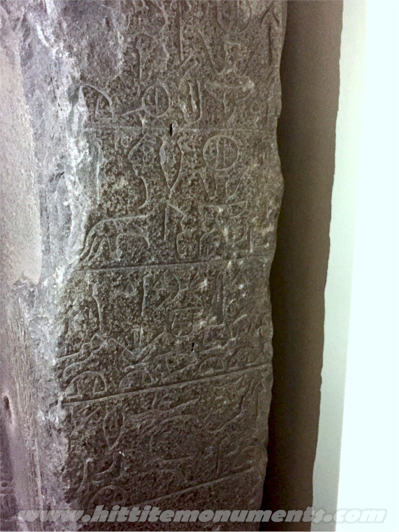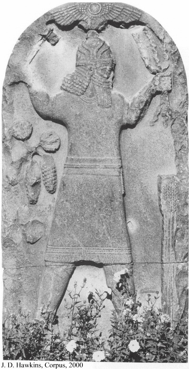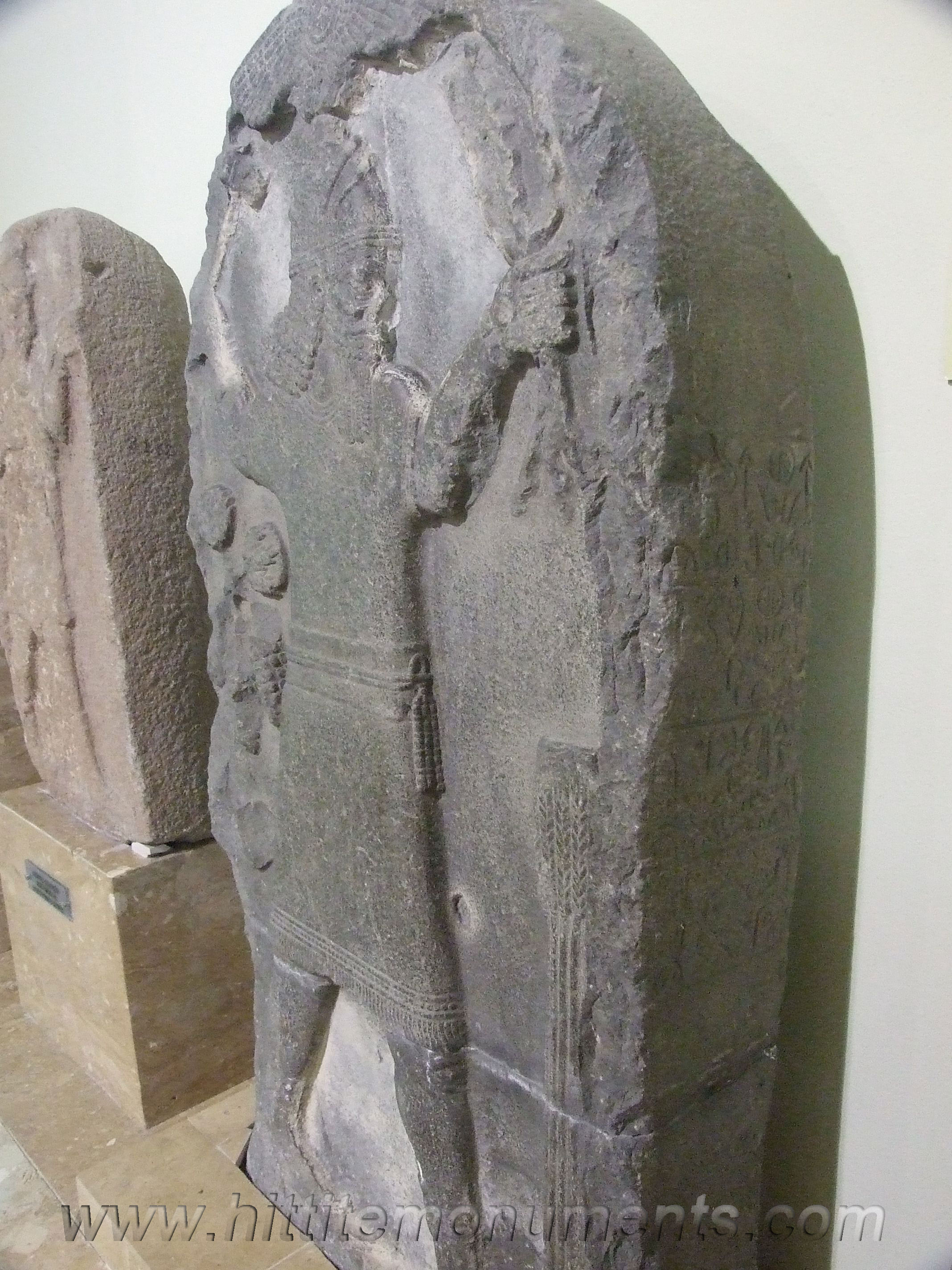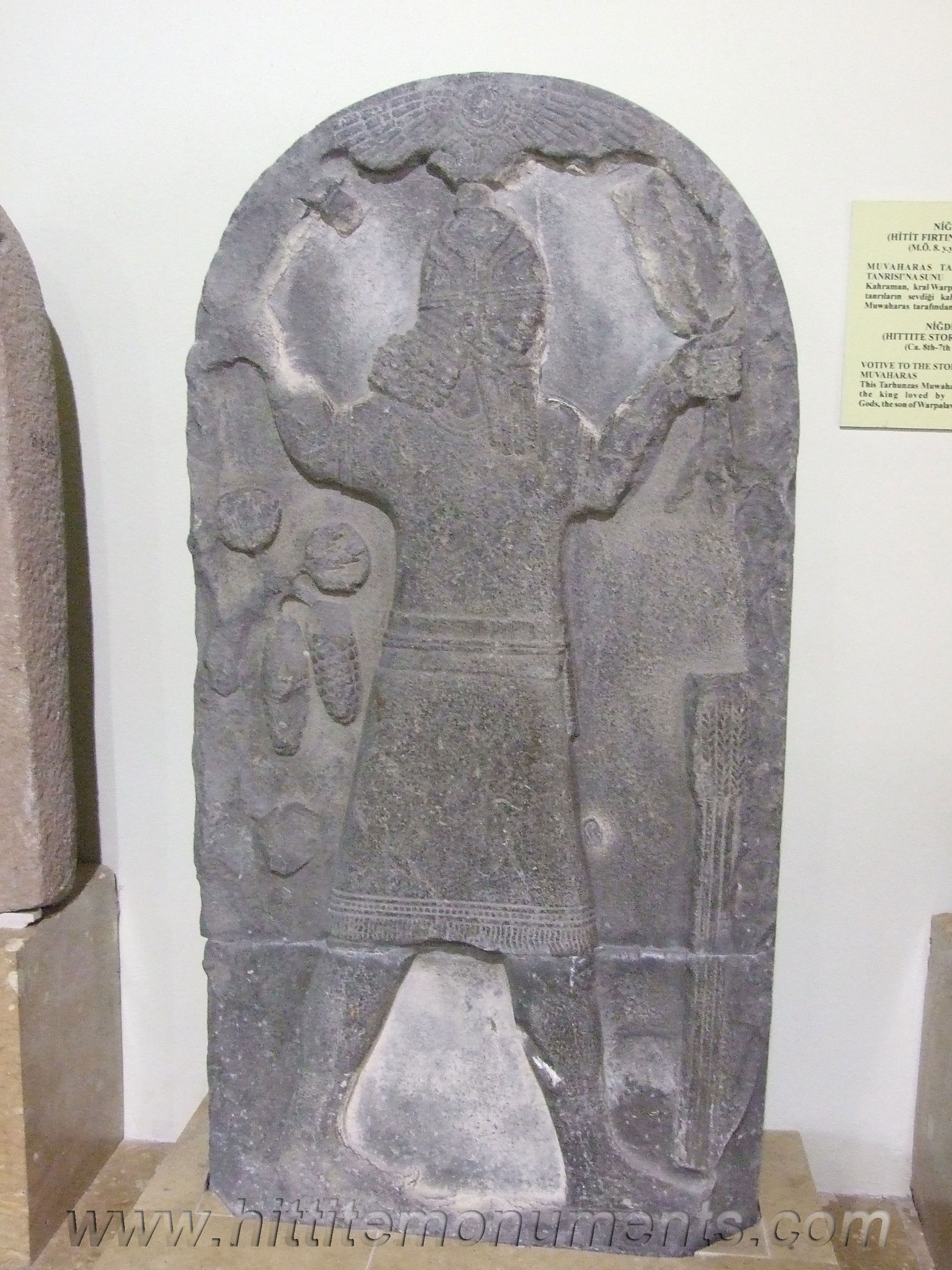 The stele with the Storm God relief was found in 1975 lying face down in front of the threshold of a mosque (Dışarı Camii) in Niğde, being used as a step. Storm-God Tarhunza is shown holding a double-axe and trident thunderbolt. Behind him is a vine with grapes ,and in front of him are stems of barley. On the side of the stele is a 4-line Hieroglyphic Luwian inscription: "This Tarhunza Muwaharani [ma]de(?), the hero, the king loved by Tarhunza (and) the gods, the son of Warpalawa the just, the hero." King Warpalawa of Tuwana is also known from İvriz, Bor, and Bulgarmaden monuments. Muwaharani being his son, the stele is dated to the end of the 8th or beginning of the 7th century BCE. It is currently in the Niğde Museum.