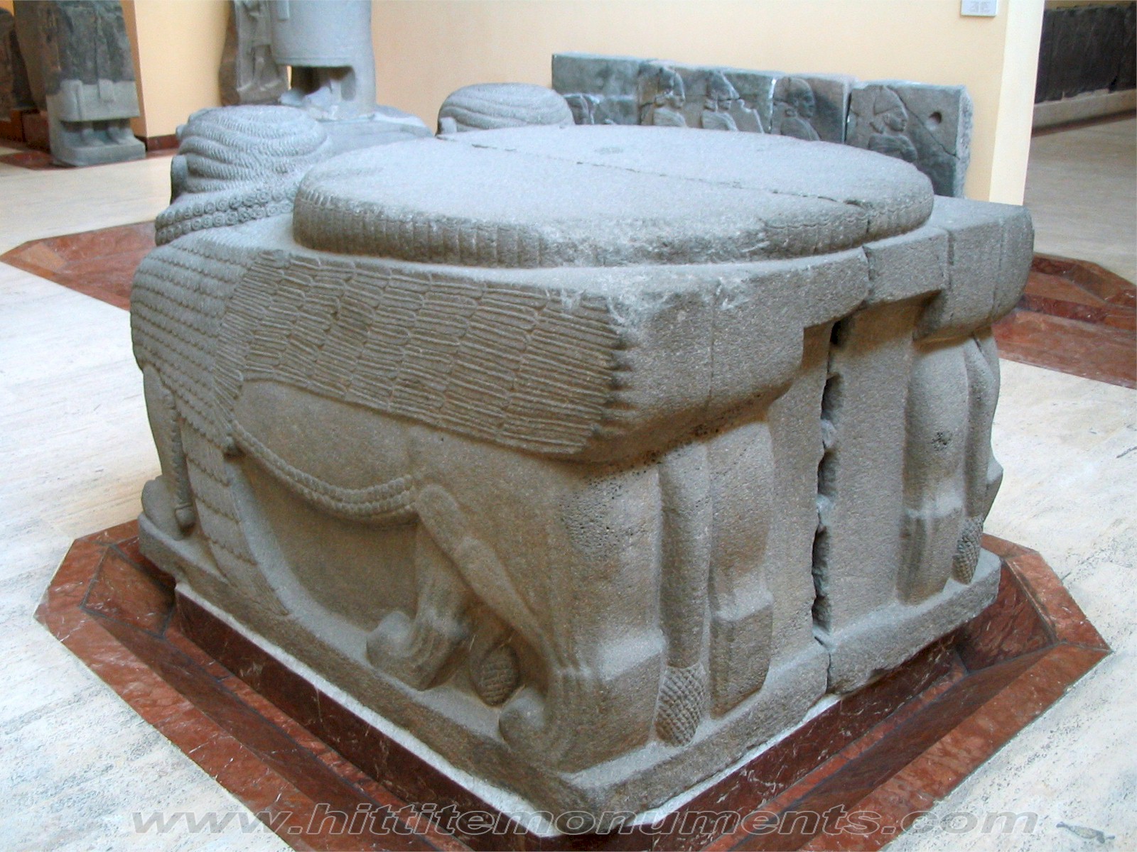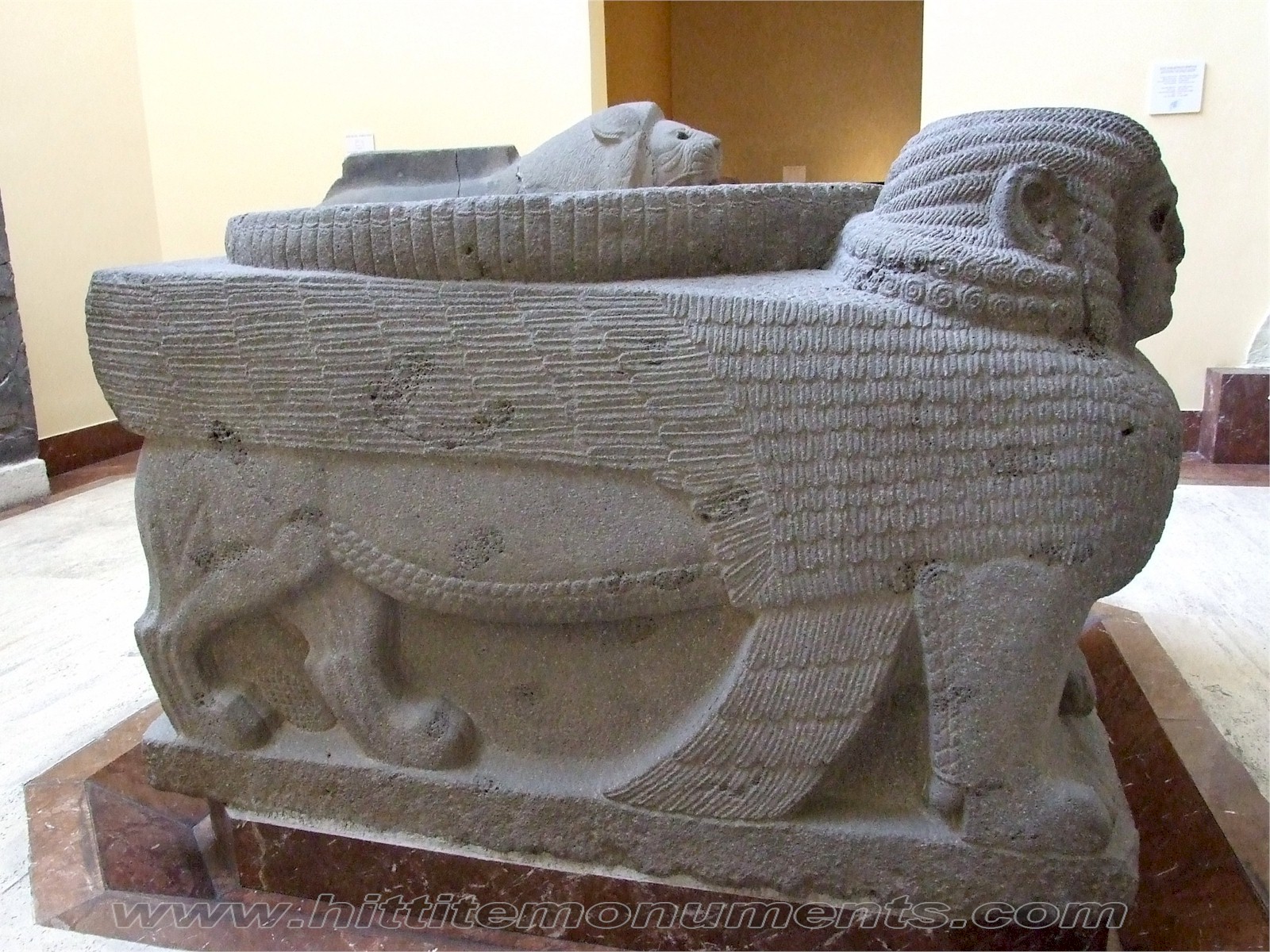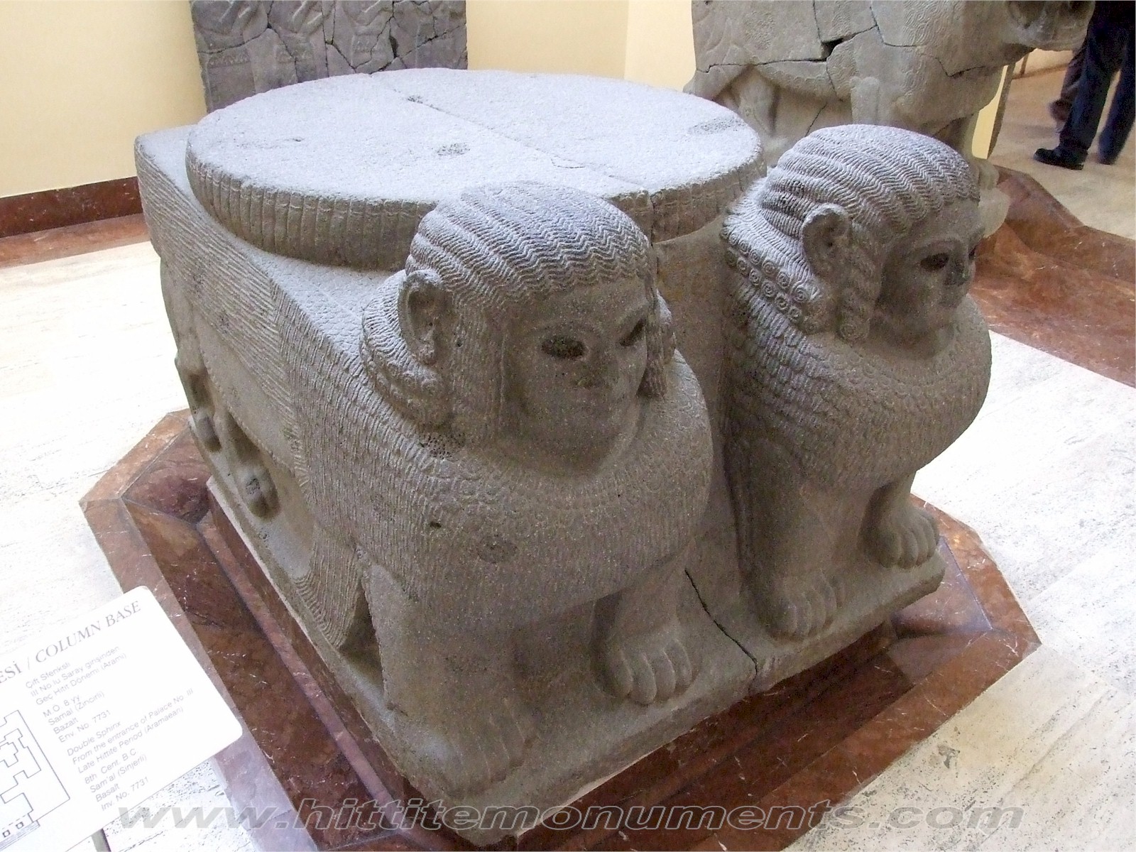 HOME - ZİNCİRLİ TÜRKÇE Colum base with a pair of sphinxes One of two double-sphinx column bases, both of which were found in situ, originally supported the two columns of the entrance of the Hilani III building. Carved from a single basalt block, it measures about 1 meter in height, 1.55 meters in length, and 1.25 meters in width. Shortly after the excavation, it was broken in half and hollowed inside for ease of transportation. The two double sphinx bases are very similar in style to another one found in nearby Sakçagözü. This base is in the Istanbul Archaeology Museum, while the other one is in the Vorderasiatisches Museum in Berlin. |