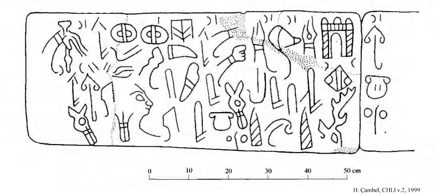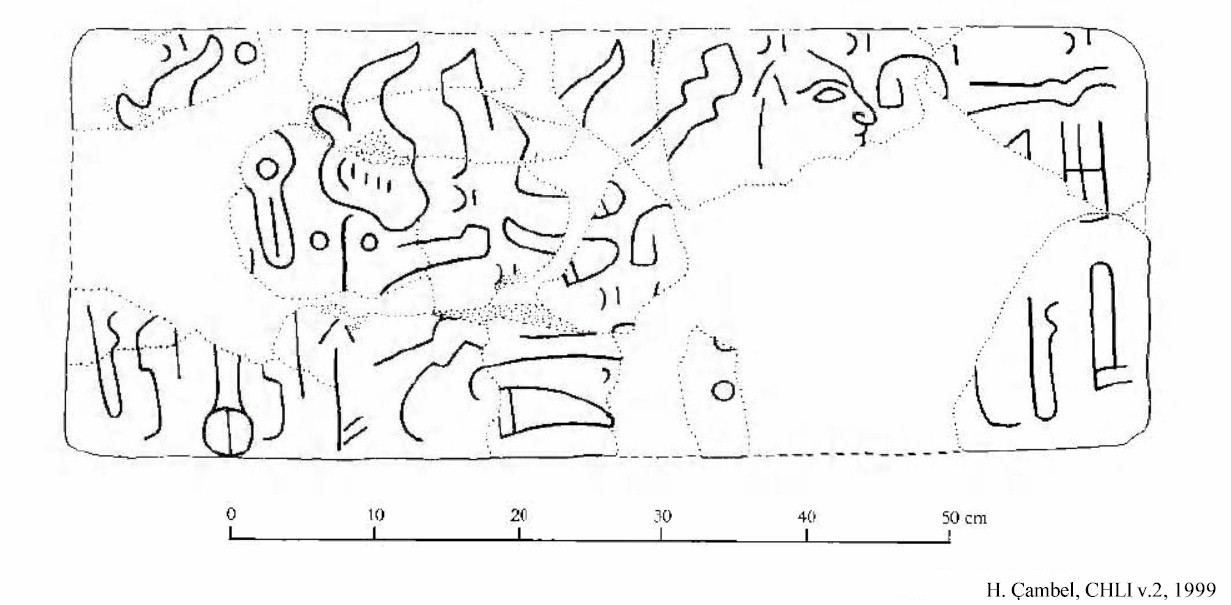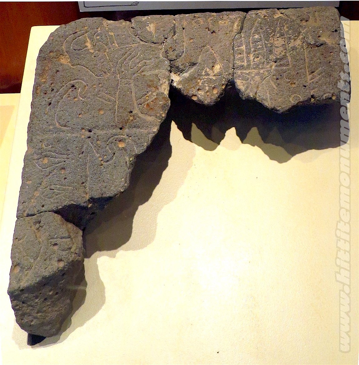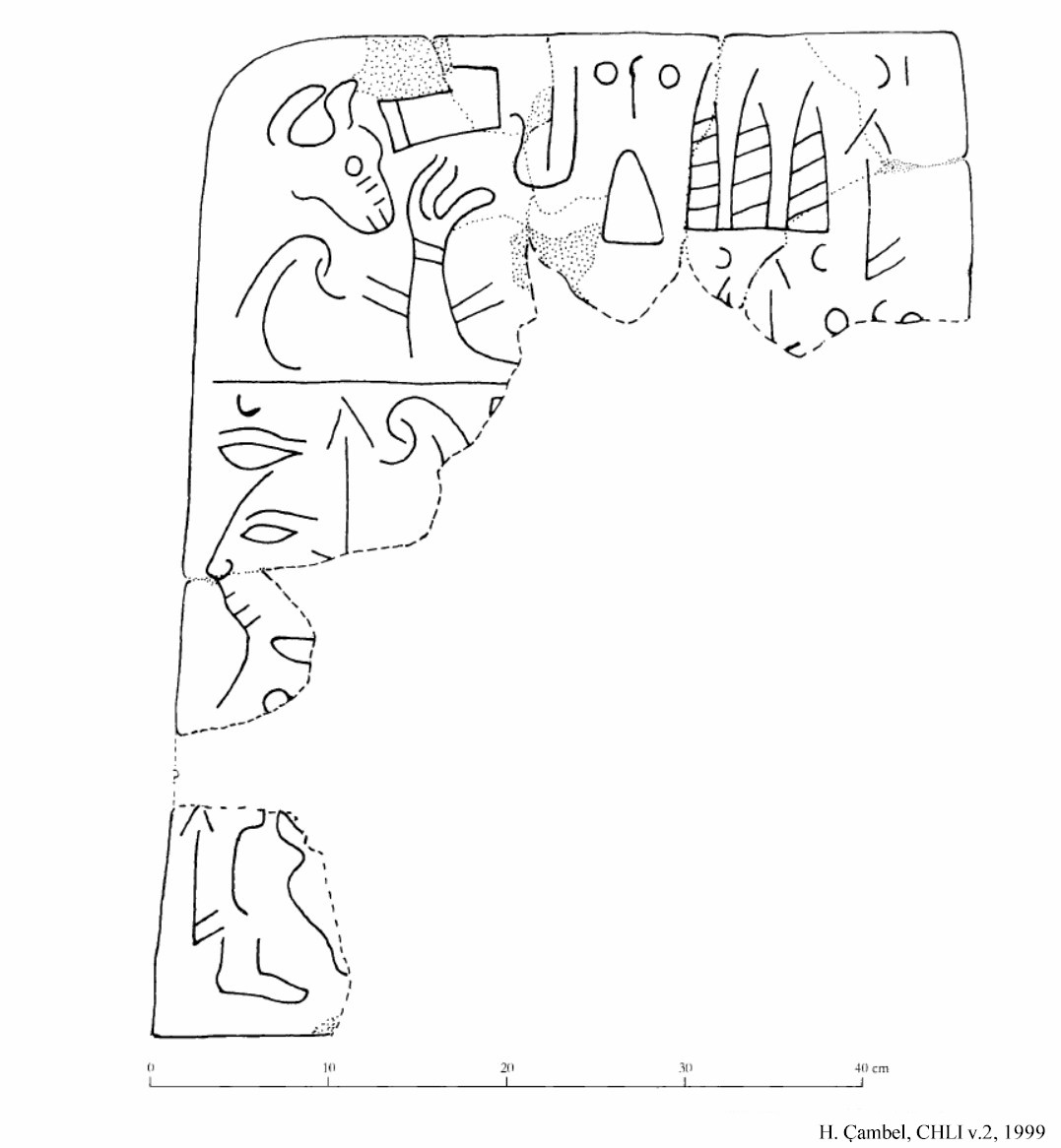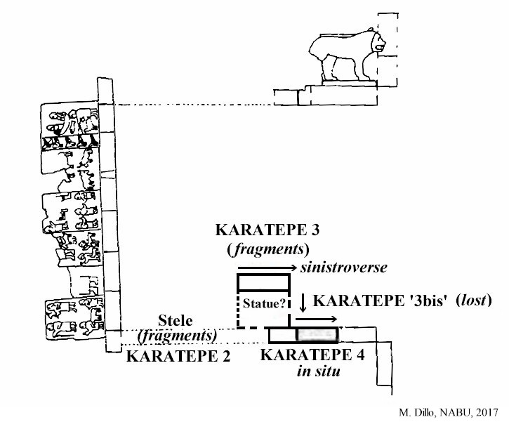 HOME - KARATEPE TÜRKÇE KARATEPE 2, 3 ve 4 Yazıtları The pieces that partially form the inscribed blocks of KARATEPE 2 and 3 were found scattered at the site, while the base blocks of KARATEPE 4 were found in situ at the southern wall of the South Gate West Court without any damage to the inscription. Basalt fragments of KARATEPE 2 with a distinct light color and hard texture belong to a 0.43 m wide and 0.18 m thick stele. Only 3 lines of the inscription are partially visible, but in its original height, the stele probably had a 5-line inscription. What can be read on it states in the third person that "this fortress ... Azatiwadas built." The KARATEPE 3 is inscribed on a 0.33 m high and 0.78 m long, heavily fragmented base block. It mentions the titles, name, and genealogy of a "River Lord" who is distinct from Azatiwada. KARATEPE 4 is inscribed on two contiguous base blocks and bears two clauses. The second clause is a scribal signature. It states that "these writings" were incised by Masani and Masanazami. KARATEPE 2–4 are not a part of the lengthy bilingual inscription carved on the orthostats and sculptures of Karatepe. Instead, they might be parts of a single separate composition. If so, KARATEPE 4 is clearly the ending of the right-to-left running inscription. The blank space that exists on the first block of KARATEPE 4 might be an indication that this space was covered by an adjoining block from which the inscription was continuing. It has been suggested that KARATEPE 3 was a part of this right-angled extension on the wall. The last image below shows the suggested locations of such a construction. KARATEPE 2, KARATEPE 3 |