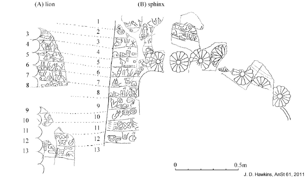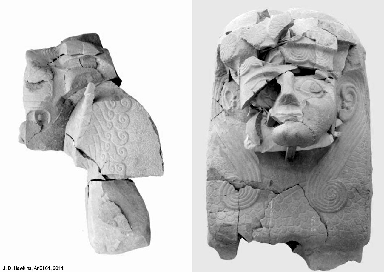 ANA SAYFA - HALEP ENGLISH Yazıtlı Kapı Aslanı ve Sfenksi Parçaları Halep kalesi kazılarının 2004 ve 2005 sezonlarında, Fırtına Tanrısı tapınağının güney girişinin batı kanadında bir kaideden düşmüş birer aslan ve sfenks heykelerine ait parçalar bulunmuştur. Oldukça hasarlı parçaların üstünde orijinali 13 satırlik Luvi hiyeroglifli bir yazıt (ALEPPO 7) mevcuttur. Yazıtın satırları birbirine bitişik olan aslanın sağ ve sfenksin sol yanı üzerine işlenmiştir. Orijinal durumlarında Aslan heykelinin 2.6 metre ve sfenksin 2.15 m yüksekliğinde olduğu tahmin edilmektedir. Yazıtın ilk satırında bahsi geçen Palistin kralının kırık olan isminin Taita olduğu düşünülmektedir. Hasar yüzünden yazıtın iceriği belirgin değildir ancak içinde Karkamış şehri ve Mısır bahsi geçmektedir. Eser MÖ 11. yüzyıla tarihlenir. |