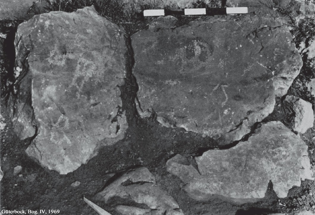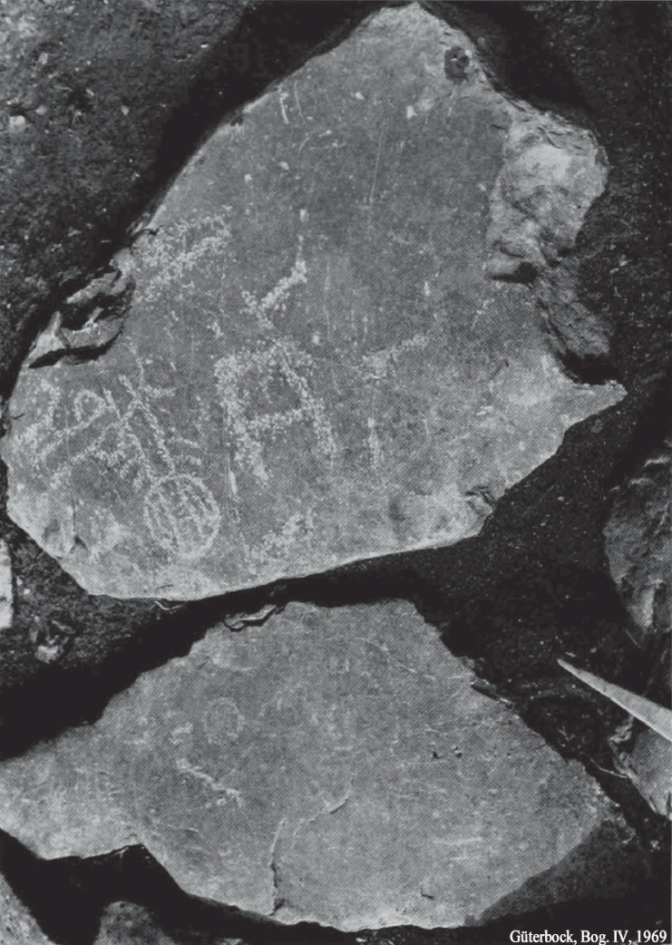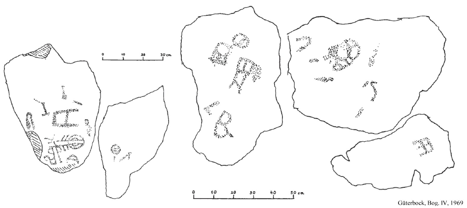 HOME - BOĞAZKÖY TÜRKÇE Pavement Graffiti (BOĞAZKÖY 14) Several stones with hieroglyphic looking graffiti have been found in the season of 1968 in the road pavement near the Great Temple. These can hardly be called an inscription since among them only a "scribe" sign can be read clearly. |
