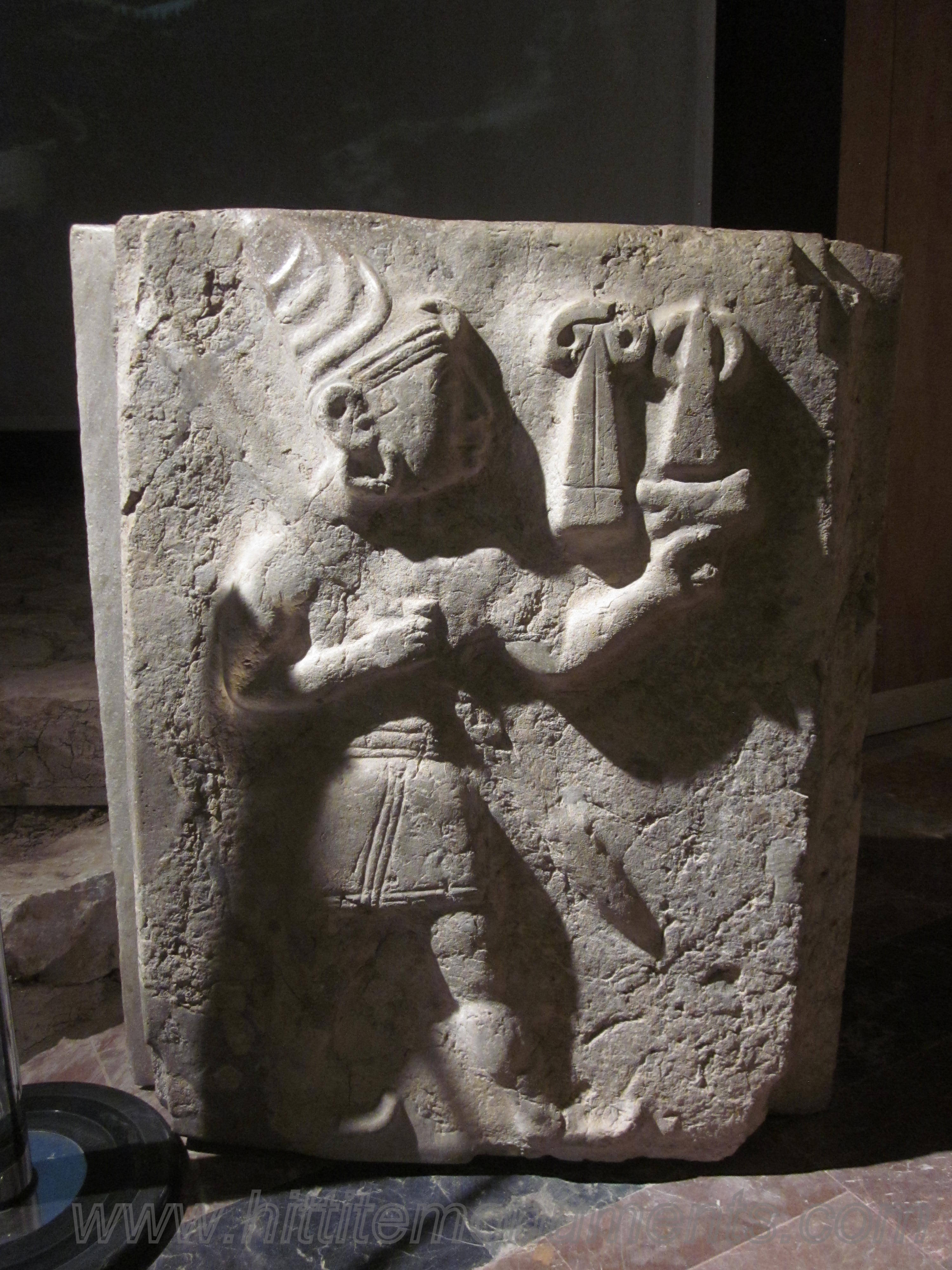 HOME - BOĞAZKÖY TÜRKÇE The Stele and Relief of Tudhaliya (BOĞAZKÖY 19) The limestone stele is about 90 cm high and 80 cm wide. It was excavated in 1985 within the ruins of Temple 5 in the Upper Town. It shows the relief of a male figure holding a spear, and the signs above his extended left arm identify him as Great King Tudhaliya. The horns on the headpiece suggest that this is a deified deceased king. This may be yet another stele of Tudhaliya IV, but since the epigraph is not in the shape of the usual aedicula of Tudhaliya IV (see BOĞAZKÖY 3, BOĞAZKÖY 18, and Yazılıkaya), this might be the representation of an ancestral king, perhaps Tudhaliya I. The stele is displayed in the Çorum Museum. |