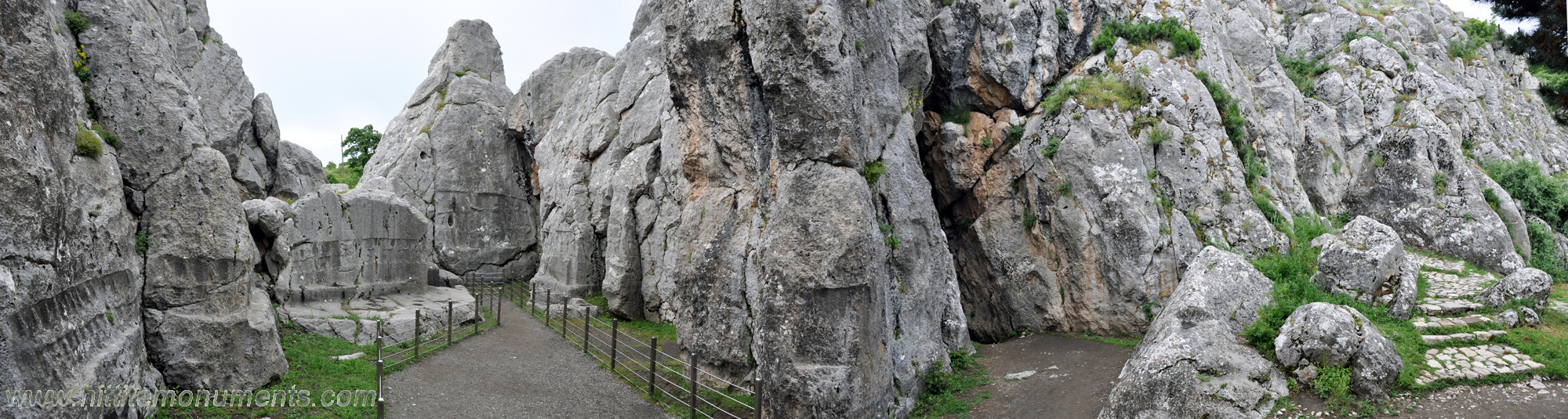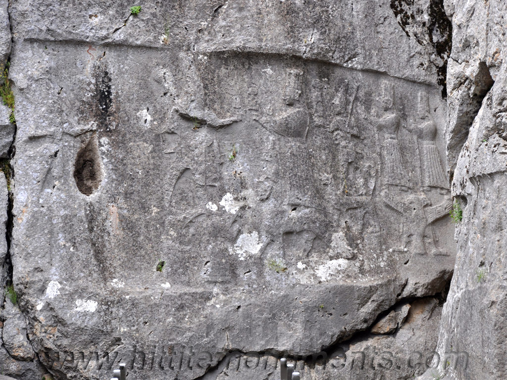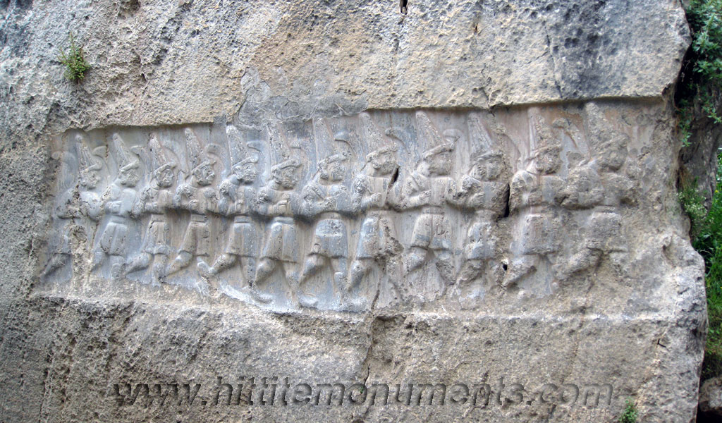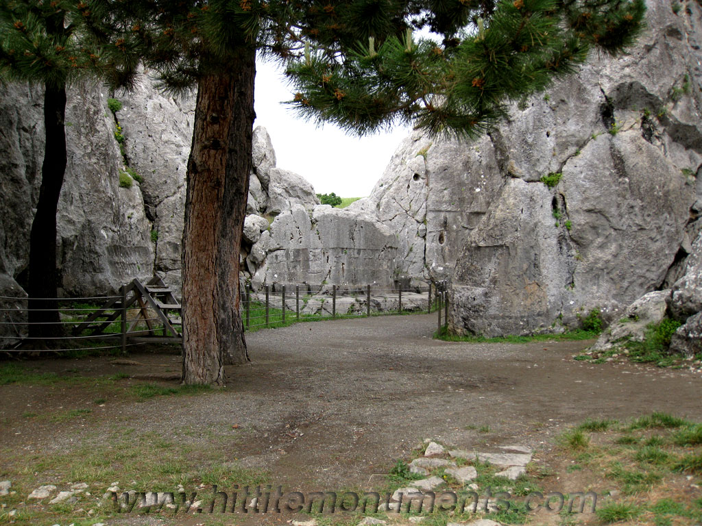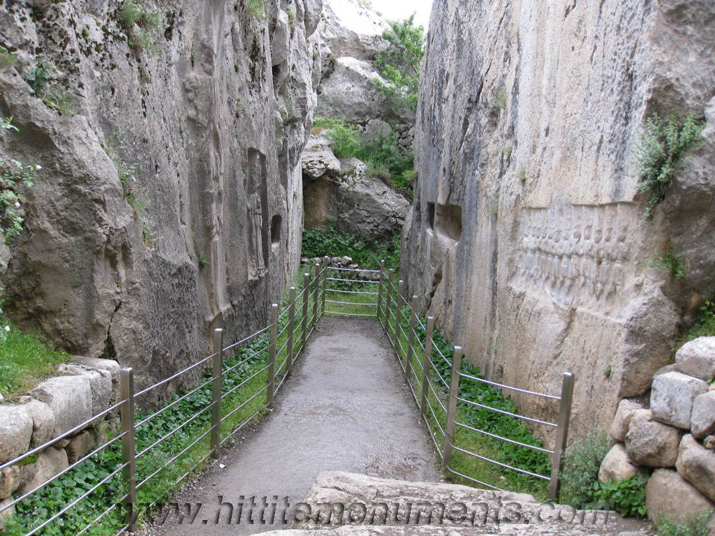 Yazılıkaya is a Hittite rock sanctuary located about 1.5 km northeast of Hattuša. It consists of two open-air chambers surrounded by natural rock formations. There is no indication that the top of the chambers were ever covered. The rock walls of the larger main chamber (Chamber A) contains relief carvings of a multitude of Hittite deities. The male deities on the left side of the walls and the females on the right are headed by Storm-god Teshup and Sun-goddess Hepat, who meet at the center of the scene. The sanctuary may have served as a place for the celebration of the arrival of the new year each spring. Chamber B is accessible via a narrow passage and it was probably a memorial chapel for Tudhaliya IV, dedicated by his son Šuppiluliuma II at the end of the 13th century BCE.