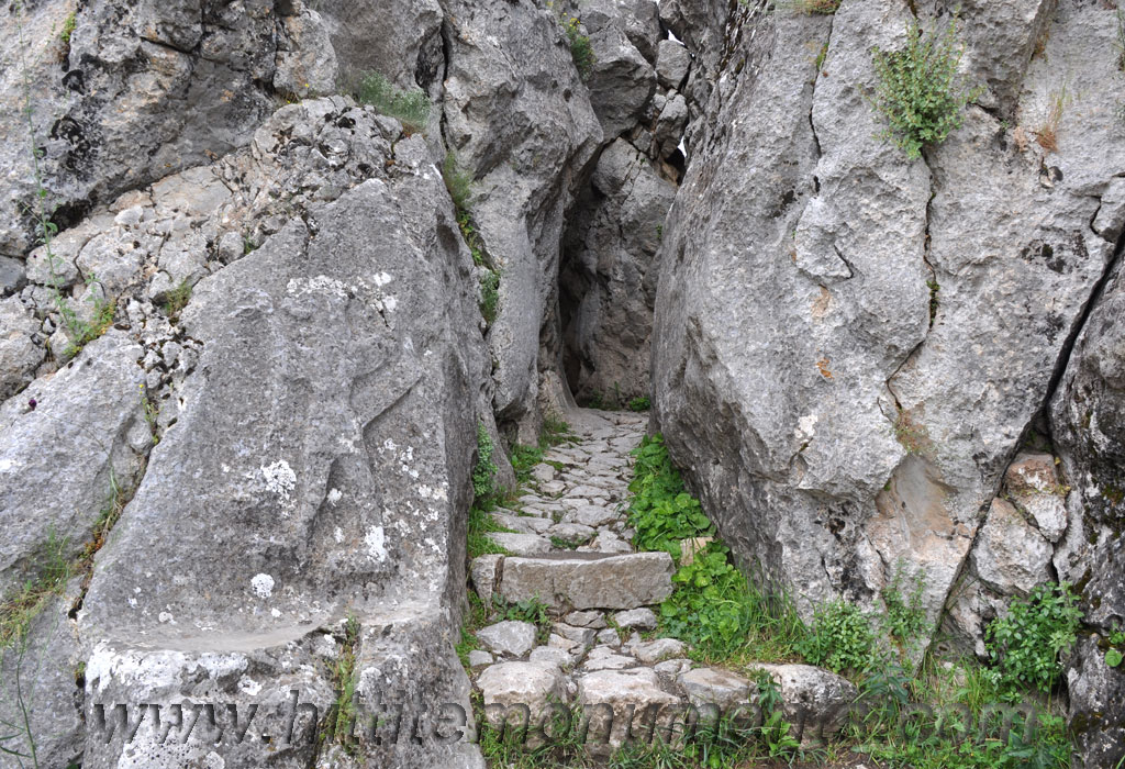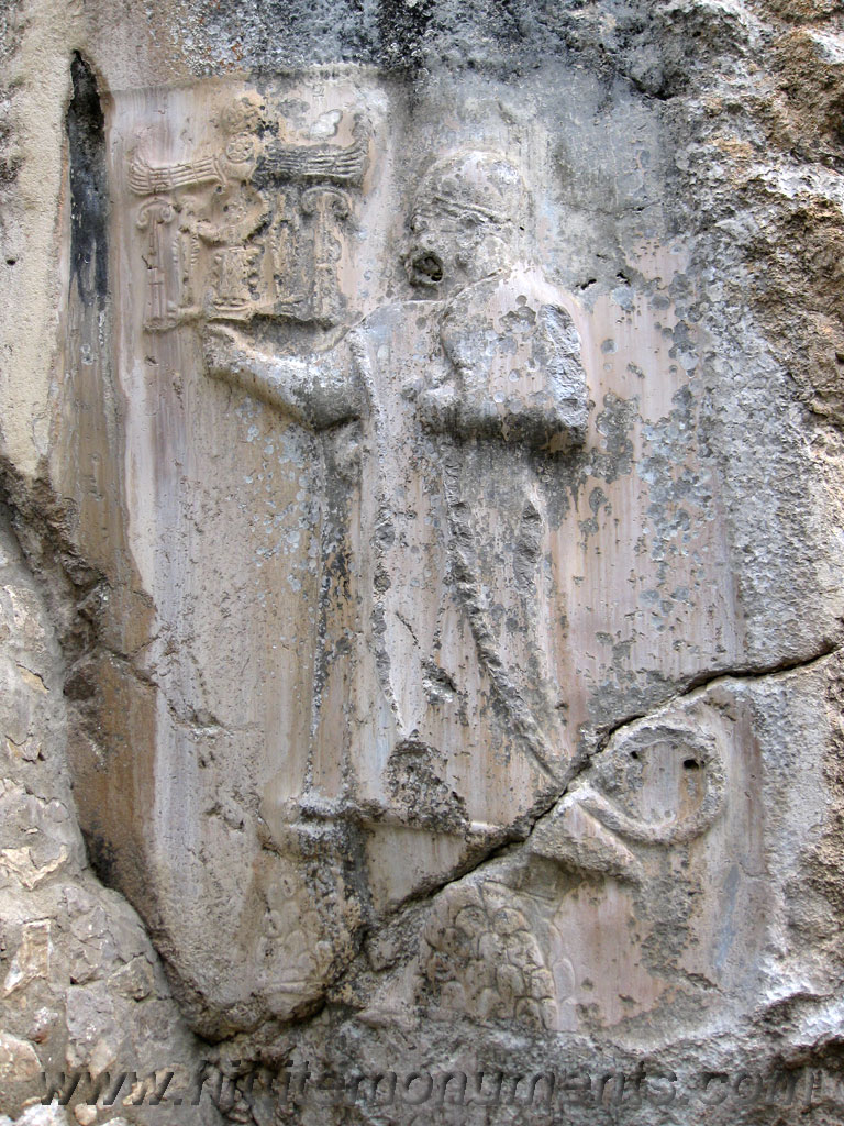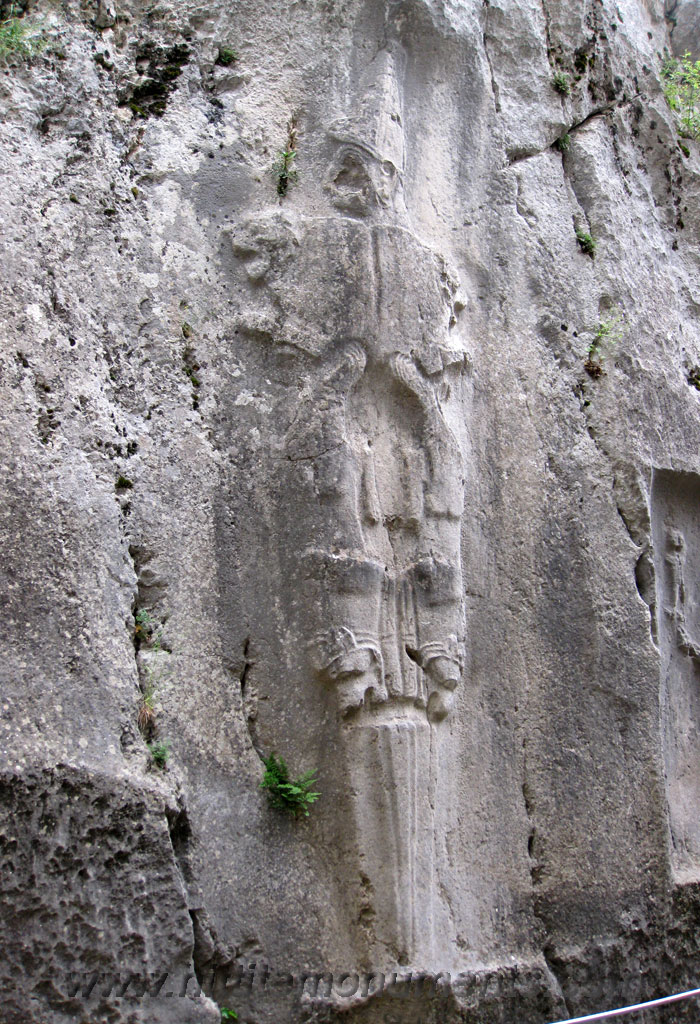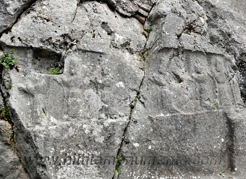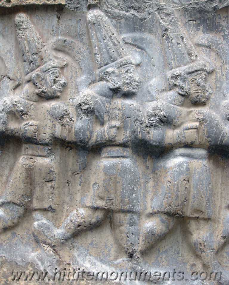 Yazılıkaya is a Hittite rock sanctuary located about 1.5 km northeast of Hattuša. It consists of two open-air chambers surrounded by natural rock formations. There is no indication that the top of the chambers were ever covered. The rock walls of the larger main chamber (Chamber A) contains relief carvings of a multitude of Hittite deities. The male deities on the left side of the walls and the females on the right are headed by Storm-god Teshup and Sun-goddess Hepat, who meet at the center of the scene. The sanctuary may have served as a place for the celebration of the arrival of the new year each spring. Chamber B is accessible via a narrow passage and it was probably a memorial chapel for Tudhaliya IV, dedicated by his son Šuppiluliuma II at the end of the 13th century BCE.