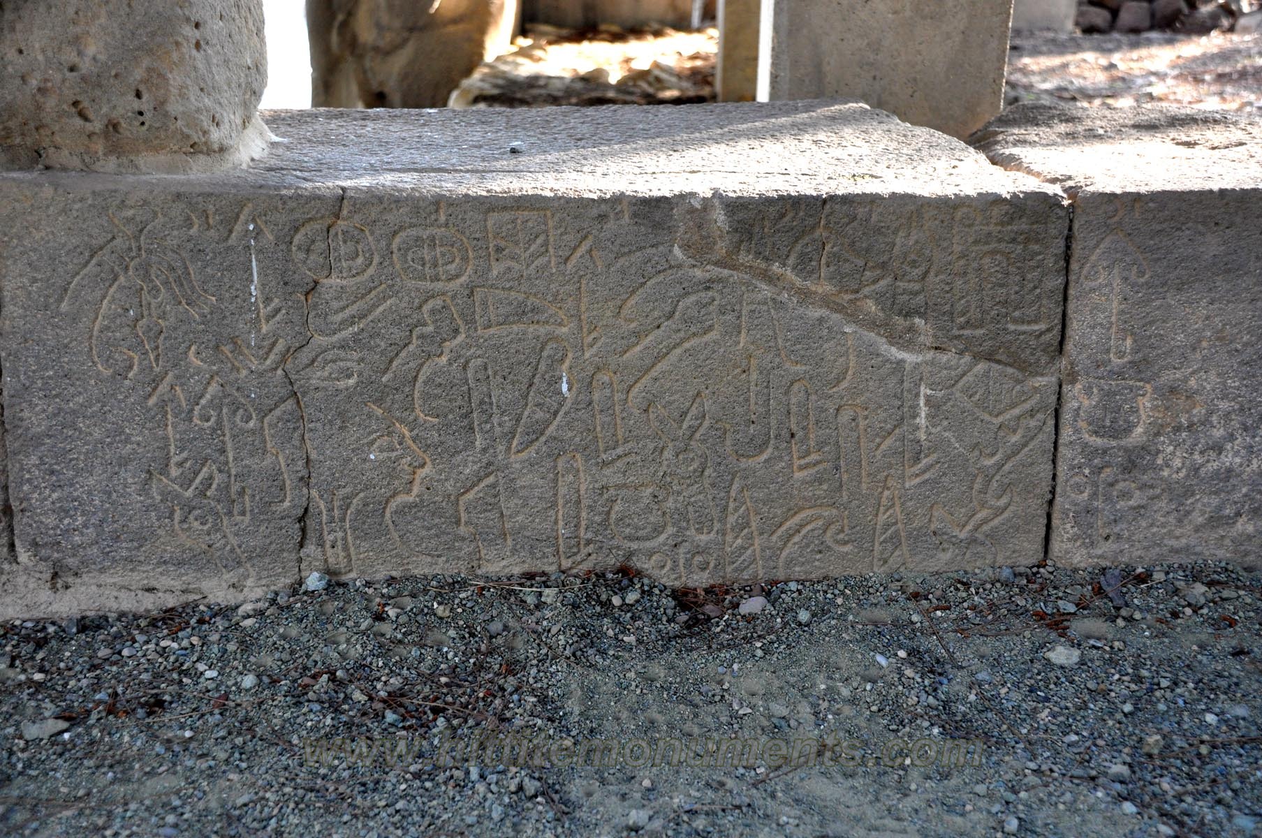 HOME - KARATEPE TÜRKÇE KARATEPE 2, 3 ve 4 Yazıtları The pieces that partially form the inscribed blocks of KARATEPE 2 and 3 were found scattered at the site, while the base blocks of KARATEPE 4 were found in situ at the southern wall of the South Gate West Court without any damage to the inscription. Basalt fragments of KARATEPE 2 with a distinct light color and hard texture belong to a 0.43 m wide and 0.18 m thick stele. Only 3 lines of the inscription are partially visible, but in its original height, the stele probably had a 5-line inscription. What can be read on it states in the third person that "this fortress ... Azatiwadas built." The KARATEPE 3 is inscribed on a 0.33 m high and 0.78 m long, heavily fragmented base block. It mentions the titles, name, and genealogy of a "River Lord" who is distinct from Azatiwada. KARATEPE 4 is inscribed on two contiguous base blocks and bears two clauses. The second clause is a scribal signature. It states that "these writings" were incised by Masani and Masanazami. KARATEPE 2–4 are not a part of the lengthy bilingual inscription carved on the orthostats and sculptures of Karatepe. Instead, they might be parts of a single separate composition. If so, KARATEPE 4 is clearly the ending of the right-to-left running inscription. The blank space that exists on the first block of KARATEPE 4 might be an indication that this space was covered by an adjoining block from which the inscription was continuing. It has been suggested that KARATEPE 3 was a part of this right-angled extension on the wall. The last image below shows the suggested locations of such a construction. KARATEPE 2, KARATEPE 3 |